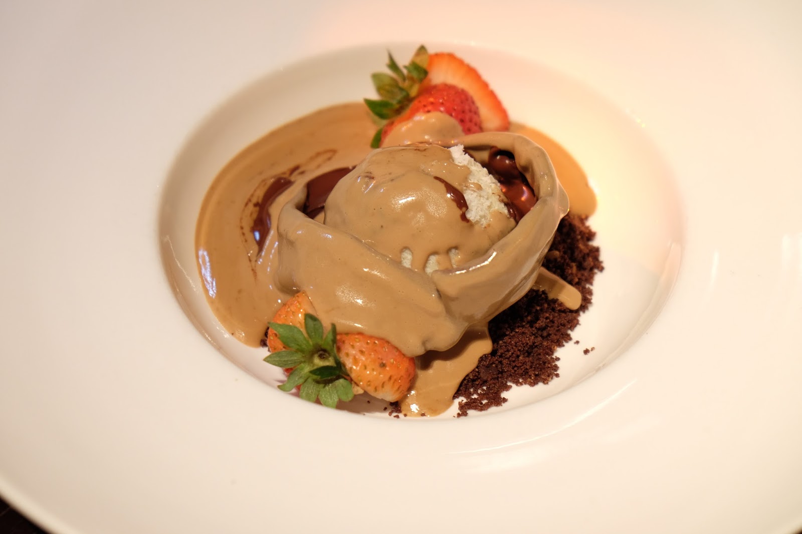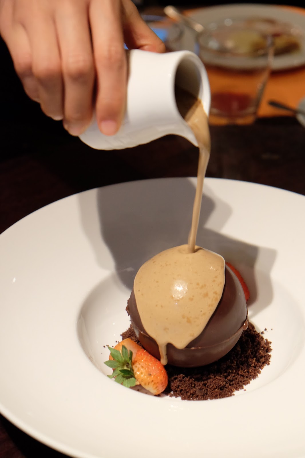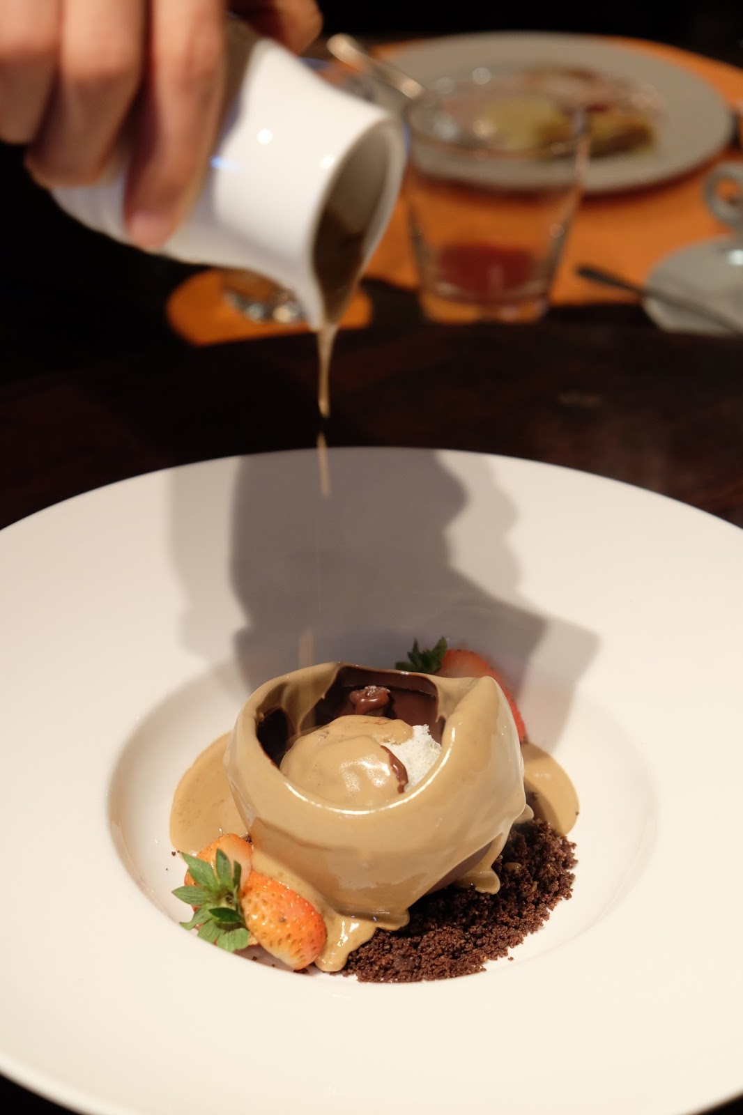 賣相絕對滿分,用熱燙的咖啡汁,澆在朱古力球上,待朱古力慢慢溶化,便露出內裡的白朱古力松露,幽香四溢,舀一口,滑溜而濃稠,用來配上一杯最愛的Earl Grey Tea,真是無以尚之的壓軸。