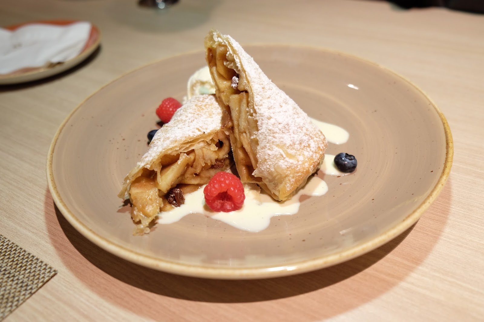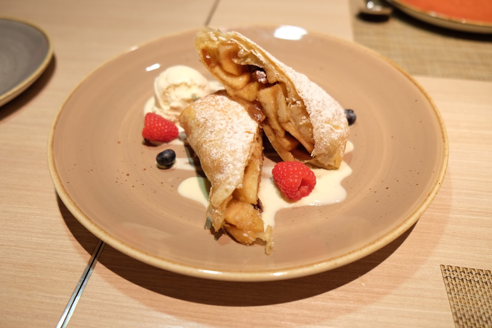 外層灑上糖霜,令賣相更佳,蘋果肉切成薄片,微微的果酸,配以清甜的雲呢嗱雪糕,想不到以這個價位,能提供高質素的食物。
