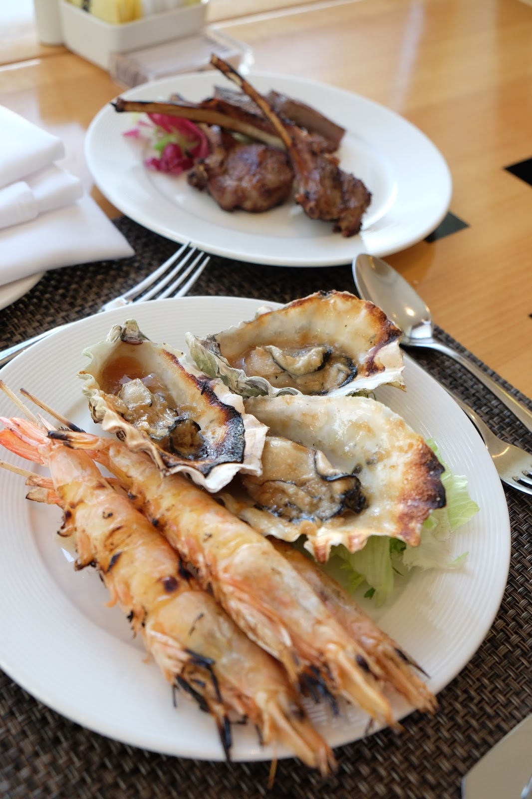 在BBQ位有海鮮、和牛及羊架,一口氣取來海蝦、燒蠔、和牛及羊架。