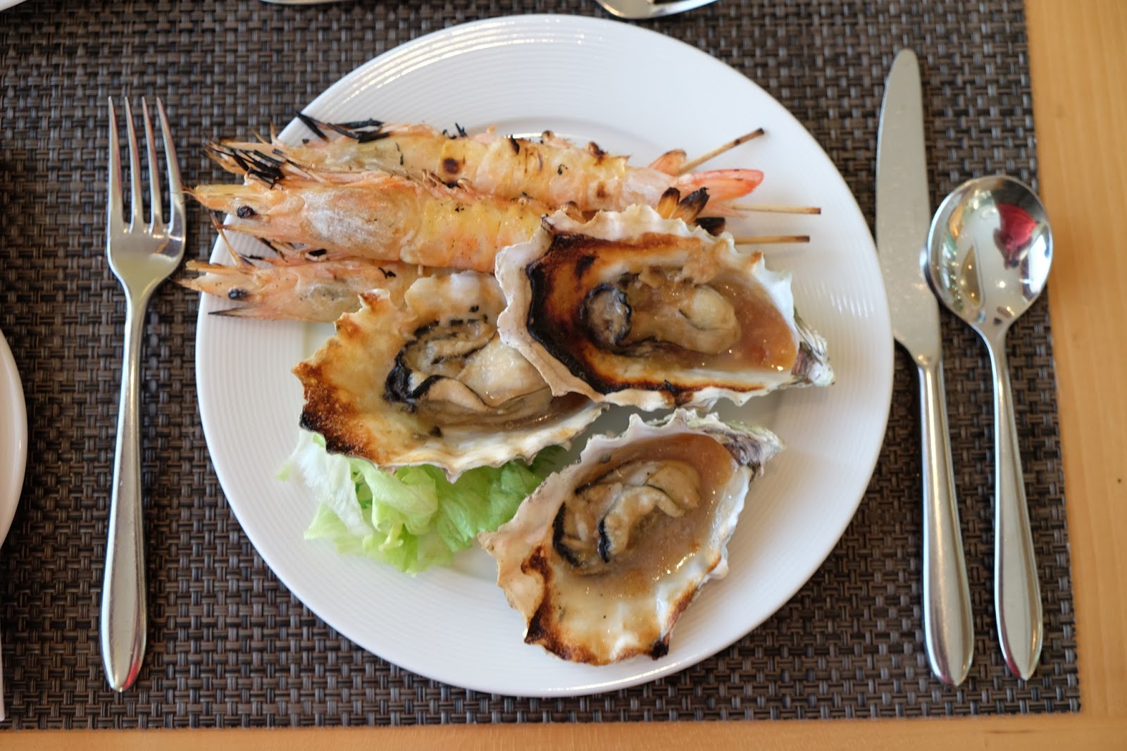 在BBQ位有海鮮、和牛及羊架,一口氣取來海蝦、燒蠔、和牛及羊架。