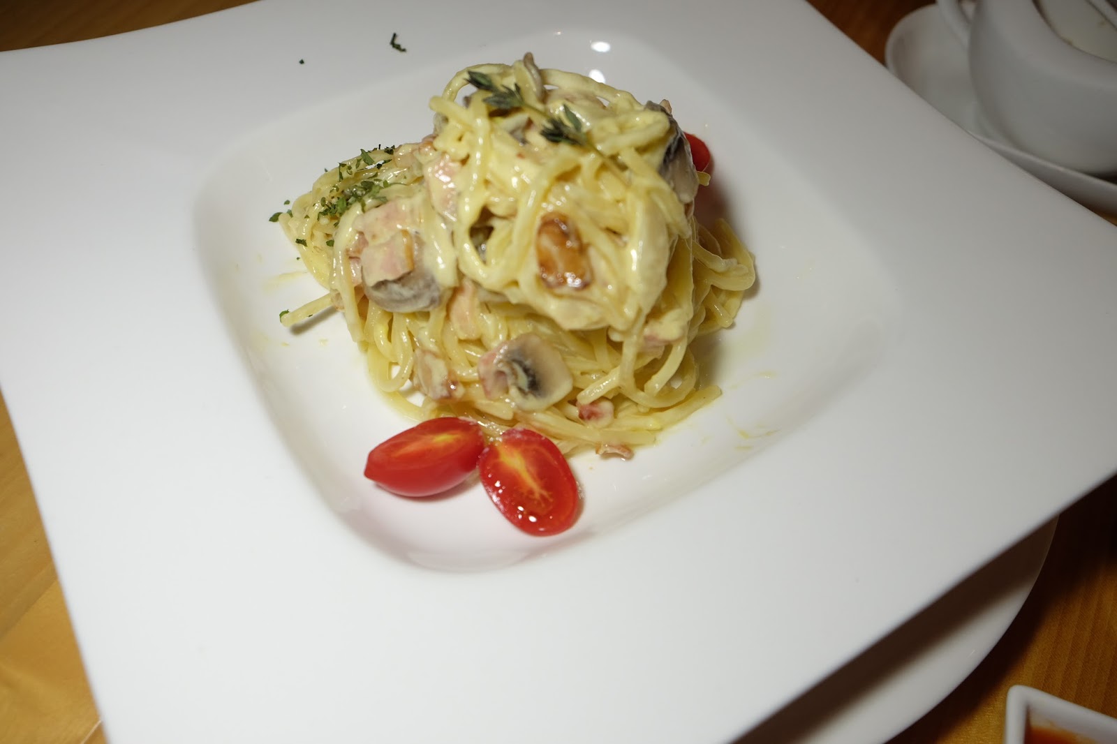 另一道即煮的Spaghetti Carbonara,滑溜甜美,但麵條煮得偏腍,欠了嚼口,有改善的空間。