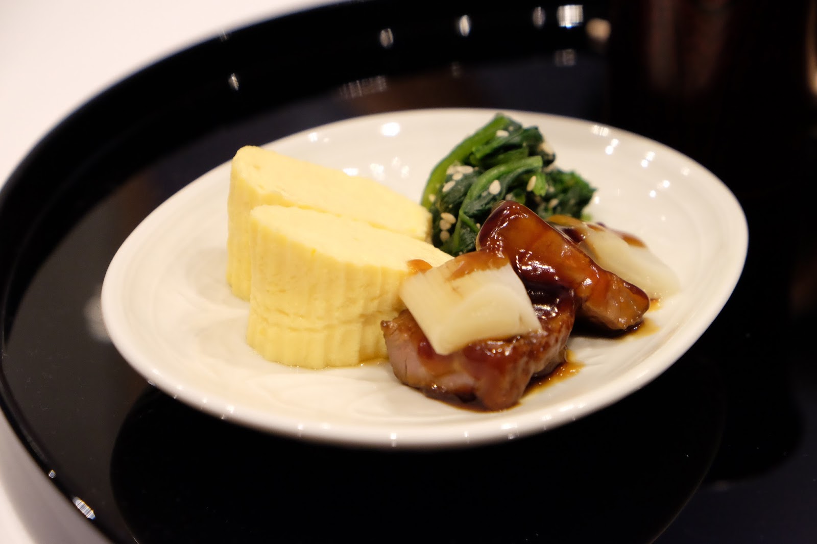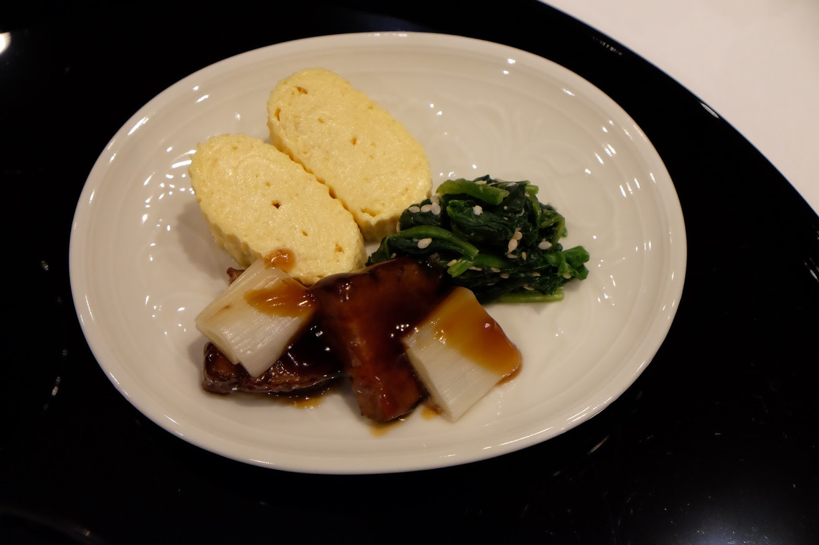 主食是關西風的蒸蛋卷、芝麻菠菜、兩片白蔥與及用甜豉油煮過的鴨胸,而米飯是選用了來自富山縣的白米,煙韌而有嚼口,滿有飯香,小小的一碗真的不夠。
