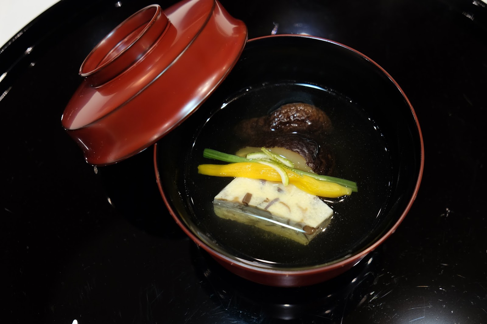 湯料賣相似蒸蛋,原來是用上千葉縣產鮑真蒸打成茸,再混和蛋漿,口感獨特。其他材料還有先炸過的椎茸菇、冬瓜皮、少許薑、金針花和及柚子皮,喝起來充滿了馥郁的清香。