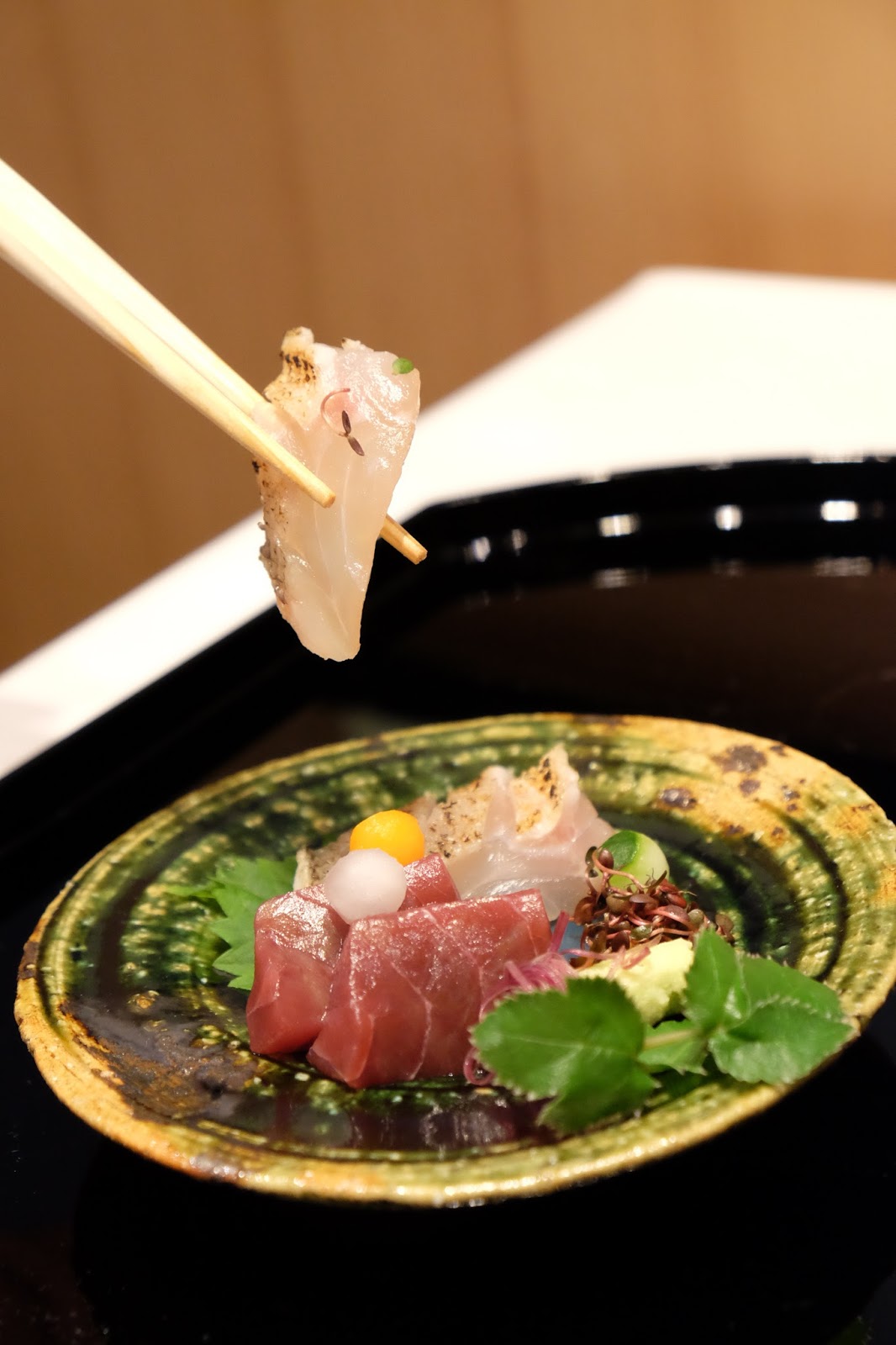 先由白身的甘鯛魚開始,魚皮經火炙過,逼出魚油的香氣,大家還可以蘸點一下加入昆布煮過的松前醬油,提鮮肉味。