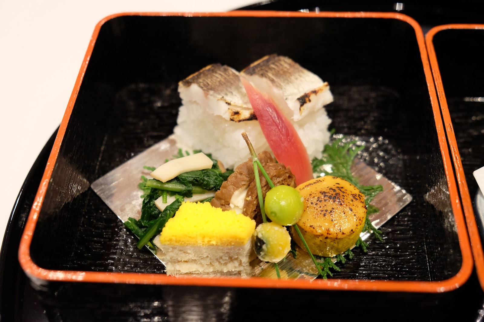 主角是竹籤魚箱押壽司,屬於時令的食材,但吃起來有點乾,反而伴碟的配菜更精彩。