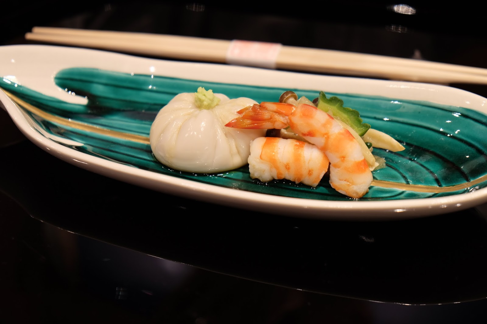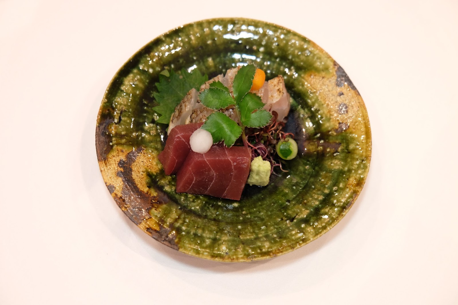即是大家所說的前菜,賣相別緻可愛,渾圓的小袋,原來是合桃豆腐,飽滿又充滿彈性,柔韌而芳香,放上少許即磨山葵,令味蕾的感覺煥然一新,伴以烤本菇、漬苦瓜和熟蝦,帶出不同的質感,實在是一個很有趣的配搭。