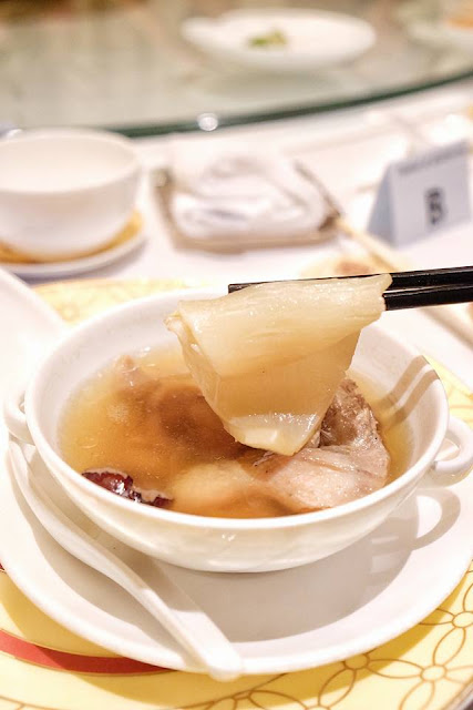 一揭開湯盅,已經瀰漫著馥郁的香氣,盅內佔了大半是湯料,舀一下,除了勁大塊花膠,與及半隻法國鵪鶉,還有紅棗、芡實、瑤柱及淮山,材料的精華,通通跑到湯內,每口都是甘甜味美、齒頰留香,喝了一半,身子已經暖和,實在是真材實料。