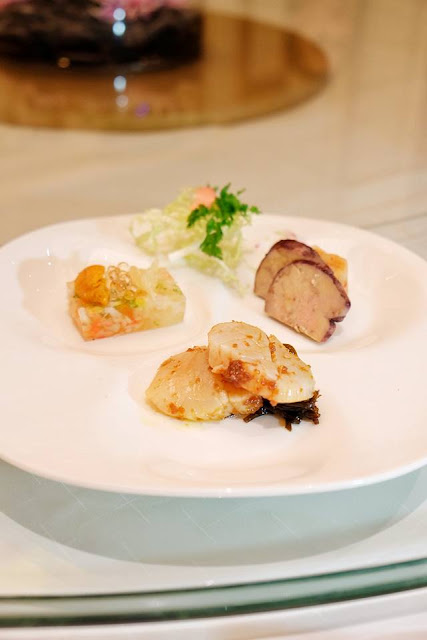 小巧的一件,蟹肉凍是用雞湯及魚膠片煮成,內裡是日本菊花與及蟹肉,入口涌甜芳香,最有趣的是置面的透明小珠,原來是無花果分子料理,單是這道頭盤,已經帶來了驚喜。