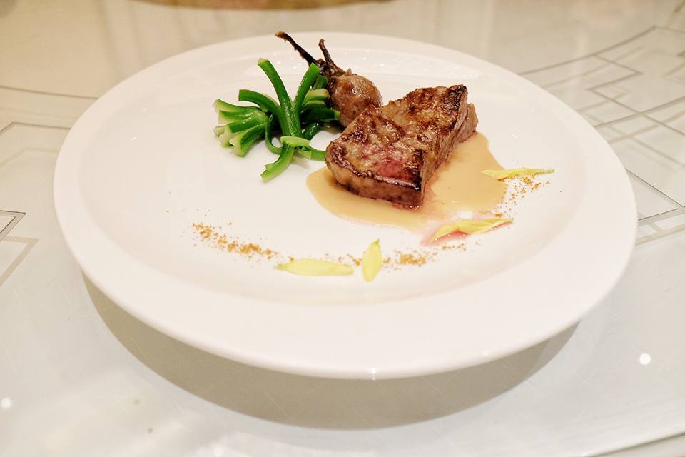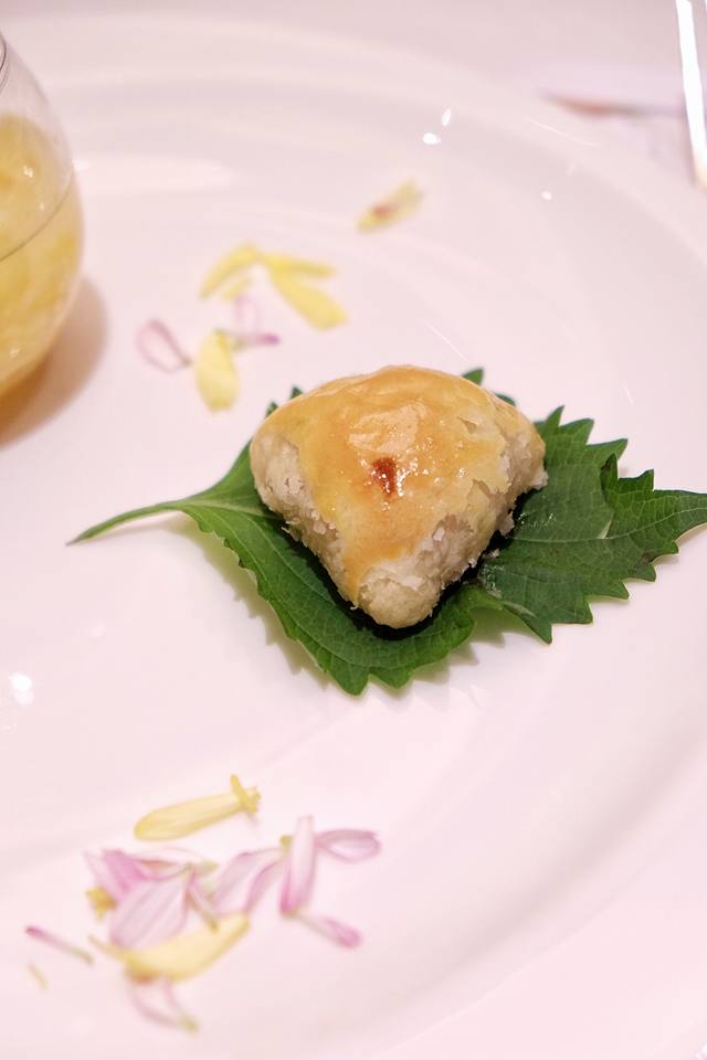 小巧的一件,蟹肉凍是用雞湯及魚膠片煮成,內裡是日本菊花與及蟹肉,入口涌甜芳香,最有趣的是置面的透明小珠,原來是無花果分子料理,單是這道頭盤,已經帶來了驚喜。