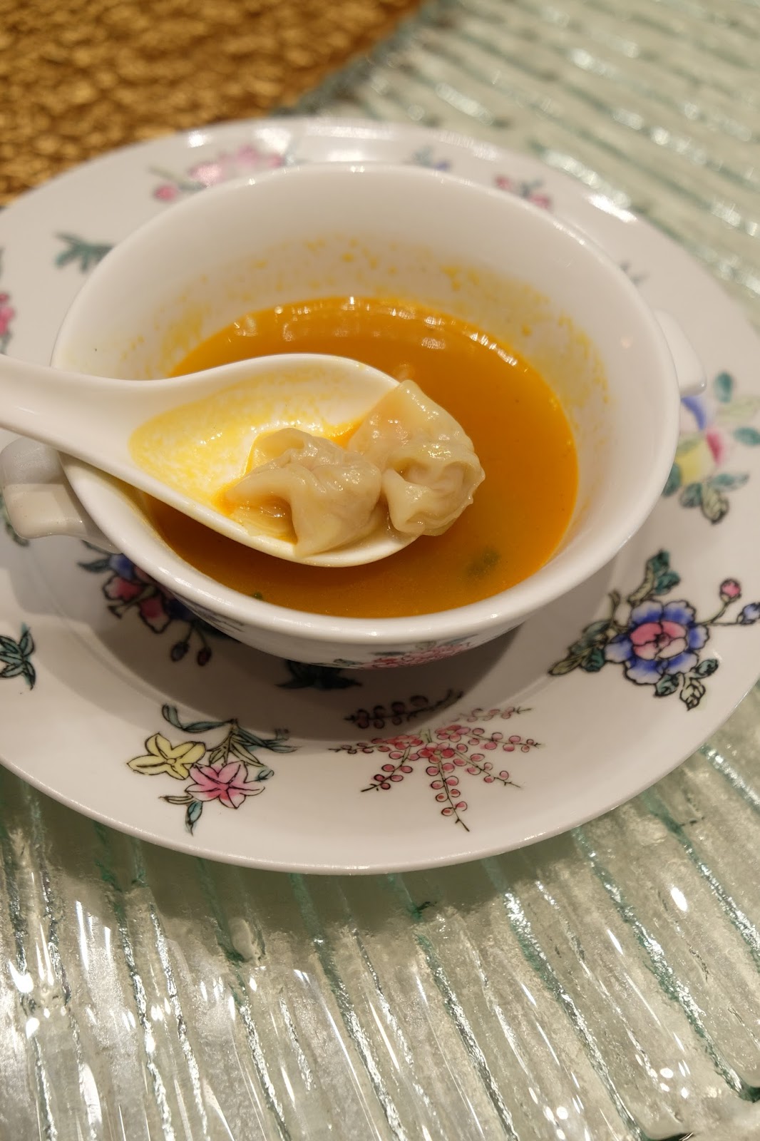 一揭開盅蓋,即時瀰漫著龍蝦湯的幽香,用湯匙舀一下,內裡是四粒小巧的雲吞,大概是指頭大小,呷口湯,口腔充滿了濃郁的龍蝦味,雲吞餡料帶少許爽口,應該是選用了爽肉位,小小的一碗,內藏了不少功夫。