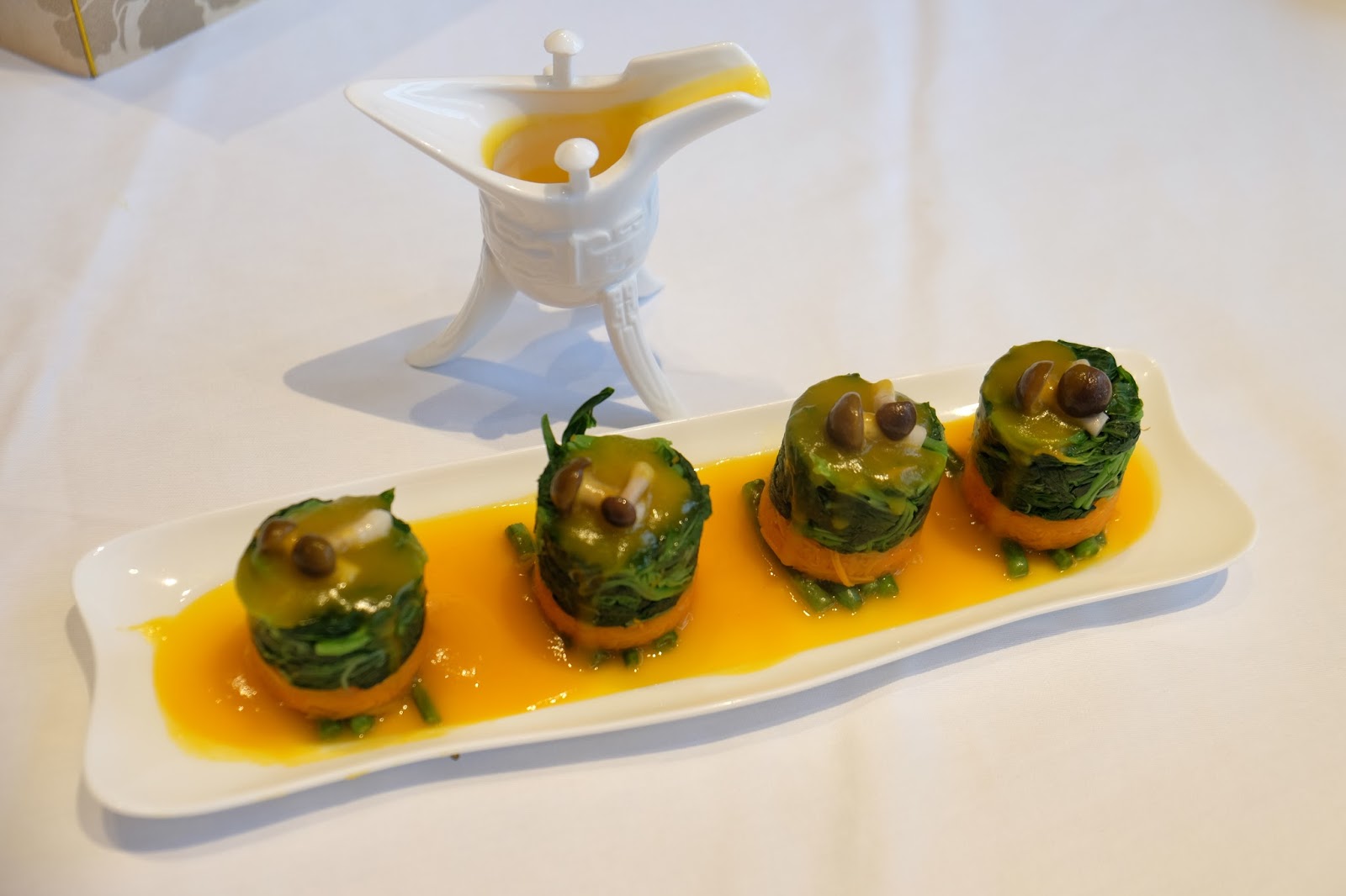 共分三屠,口感各有不同,由上而下,是菇菌、莧菜及甘筍絲,再淋上濃稠的南瓜汁,多添了一份甜味。