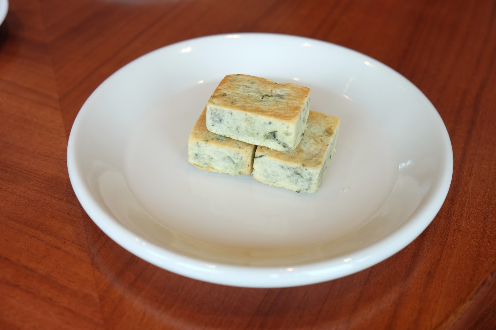 如果不說,還以為是鳳梨酥,但紅豆餡料內含十年的陳皮,可不是說笑的,絲絲幽香在滲出,令人吃起來不會太膩,加上又有龍井茶的清香,令整件甜品味道更完美。