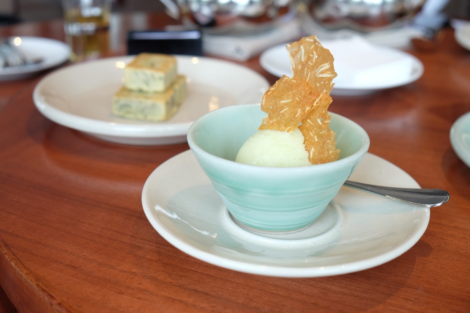 舌尖先感受到苦瓜的甘甜,然後是子薑的清香,令人精神為之一振,插上一片紙豬肉片,不單令賣相亮麗,用來舀起雪葩,多添香脆的口感,真的很有趣。