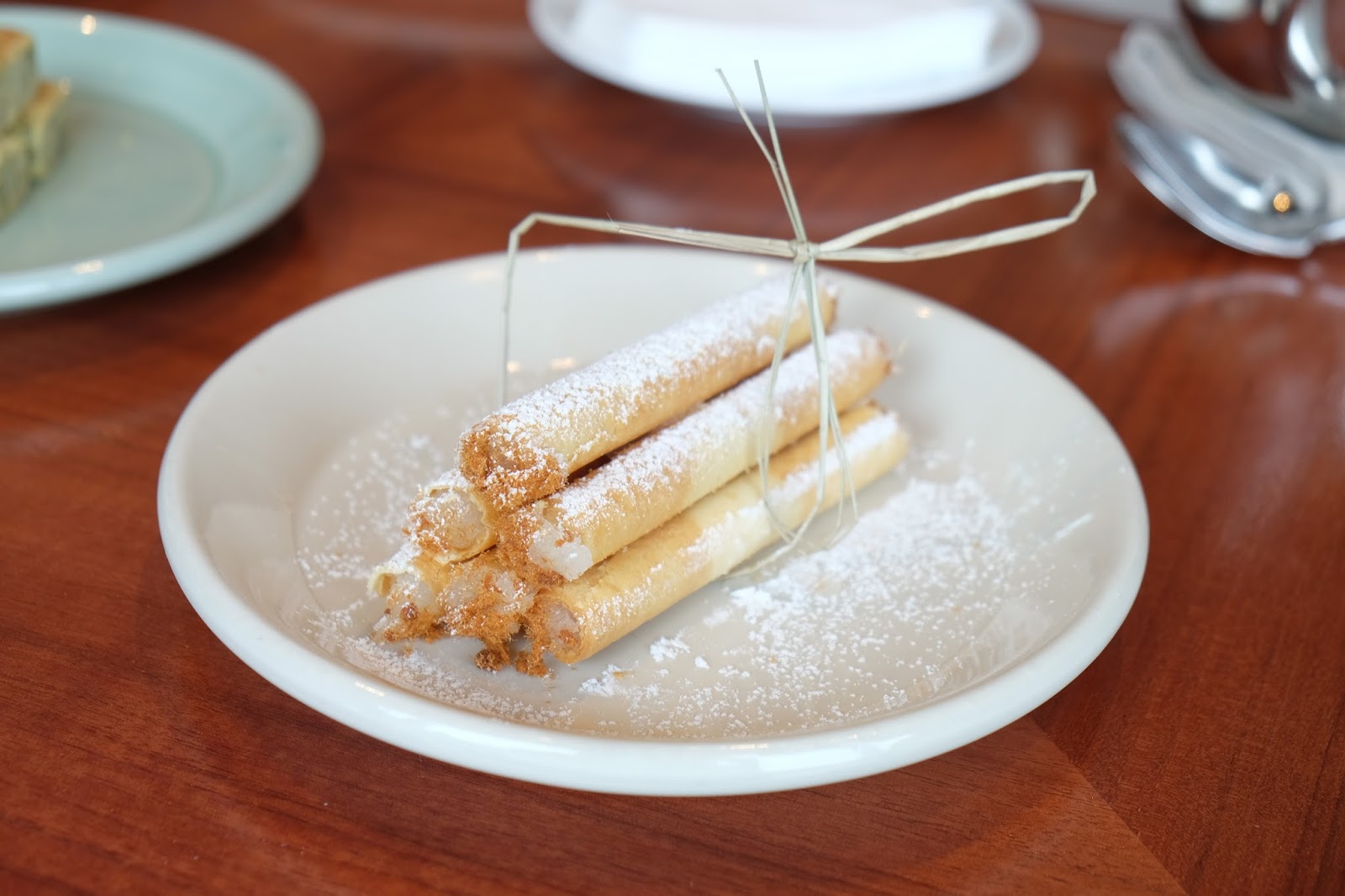 只有尾指粗的脆蛋卷,內裡竟然釀入了酸薑蒿頭,外層酥化,而餡料酸酸甜甜的,實在令人懷疑是否真的是甜品?