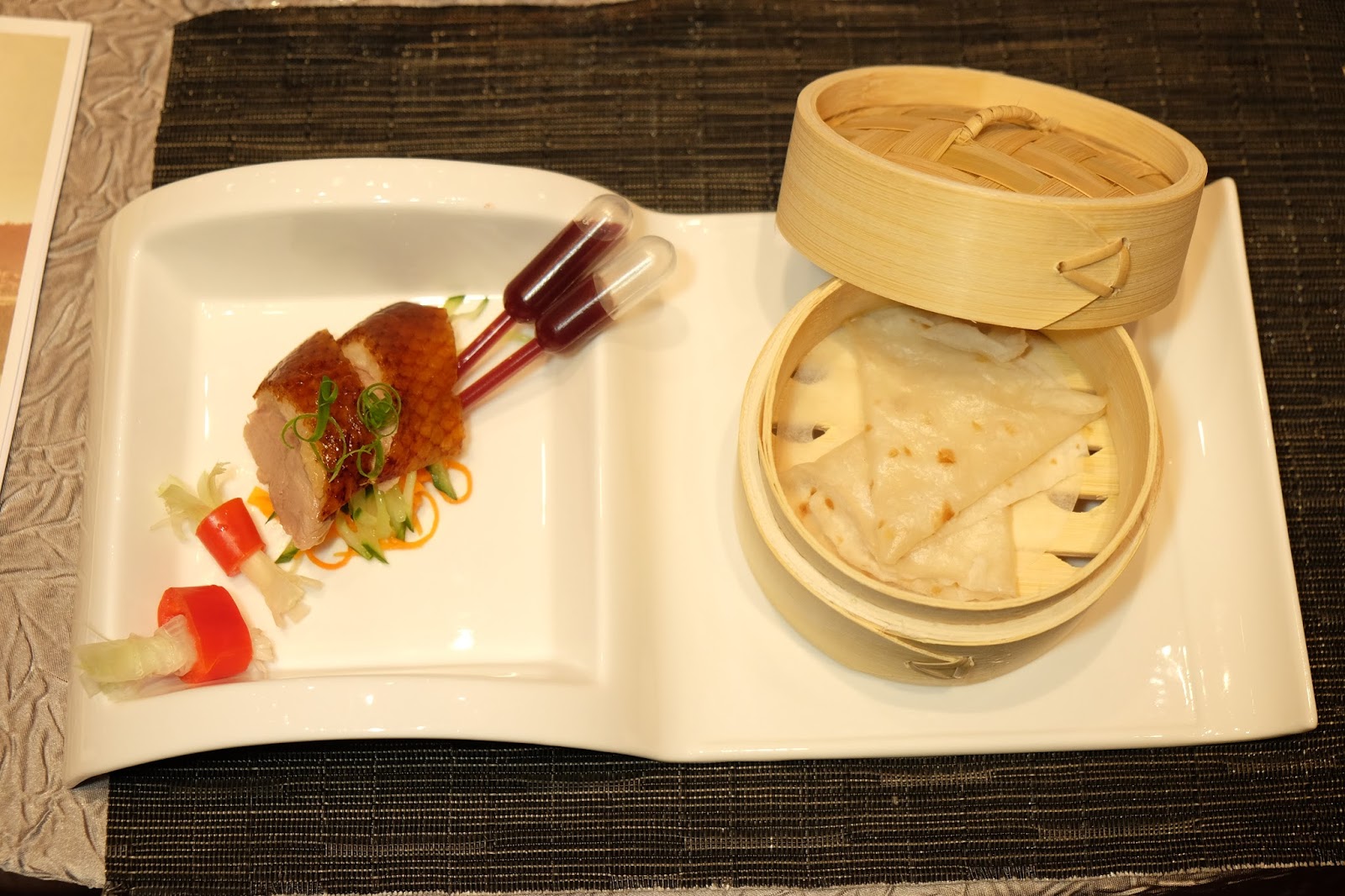 充滿了玩味,兩片烤鴨件伴兩枝吱筒,旁邊的小蒸籠,有新鮮出爐的薄餅皮,加入京蔥絲包好,好有「煮飯仔」玩味,一口一件,鴨皮仍帶微溫及脆口,咀裡又有油香,好味。