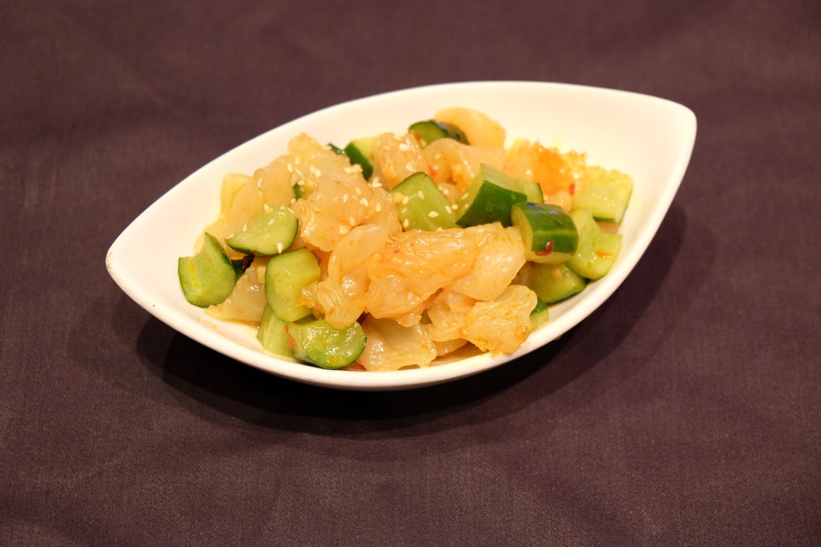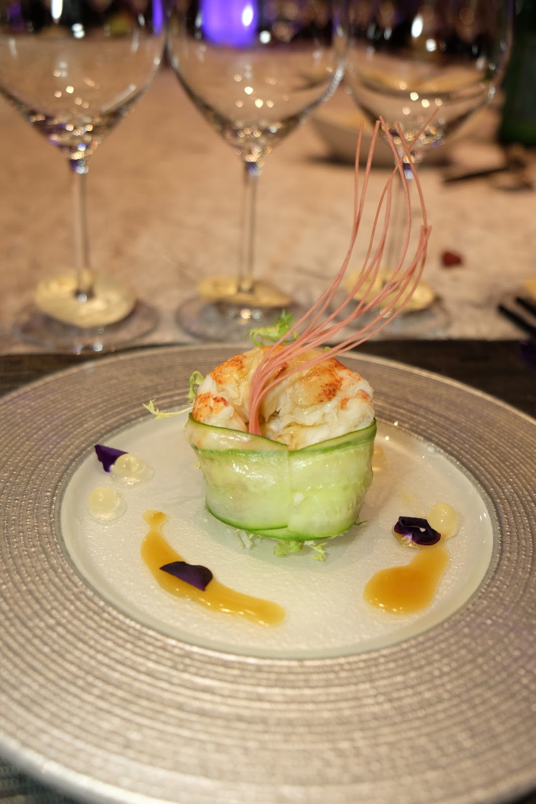 賣相簡單亮麗,龍蝦起肉,加入沙律菜,再以青瓜片包裹,伴碟小珠原來是柚子汁,令口感更清新。