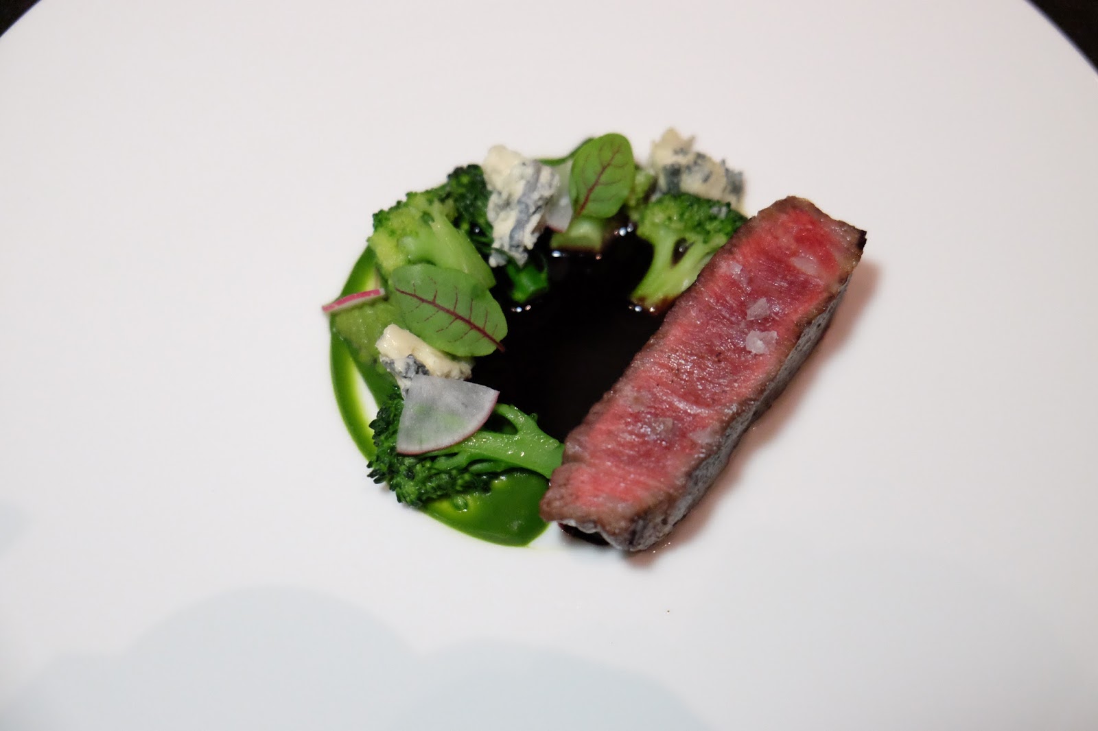 beef with variation of broccoli, Fourme d’Ambert, leek ash & spiced port