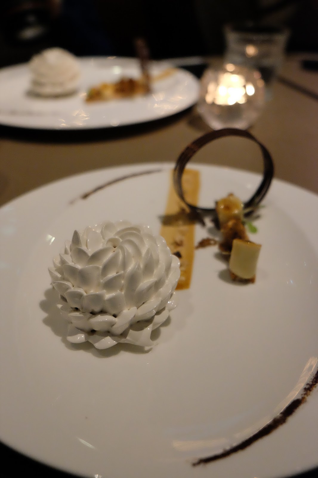 壓軸的甜品,單憑賣相已經知道花功夫,以忌廉吱出蓮花座的造型,確實帶點中國風,內藏了香滑的雲呢拿雪糕與及越南咖啡雪糕,再咬上一口脆榛子,形成複雜口感,相信就算不是甜魔一族,都會被深深吸引,唯一要挑剔的,就是太甜了,有少許改空間。