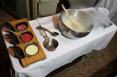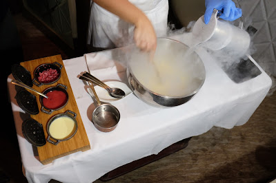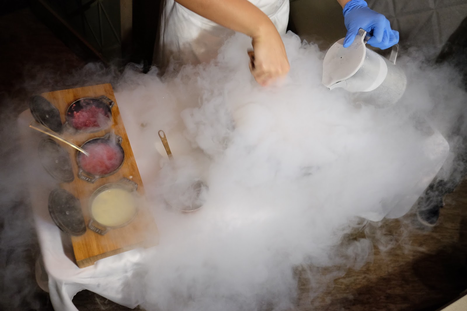 師傅先把液化氮注入雪糕漿內,即時冒起煙霞,四周氣溫同時下降,師傅不停的攪拌,直至成形後放在撻底上備用,然後再將玫瑰花浸在液化氮加以急凍,變成硬塊後弄碎,隨意灑在雪糕面,充滿了玩味之餘,更有玫瑰花的馥郁芳香,再以優美謐靜的夜色陪襯下,莫過於跟另一半分享這甜美的一刻。