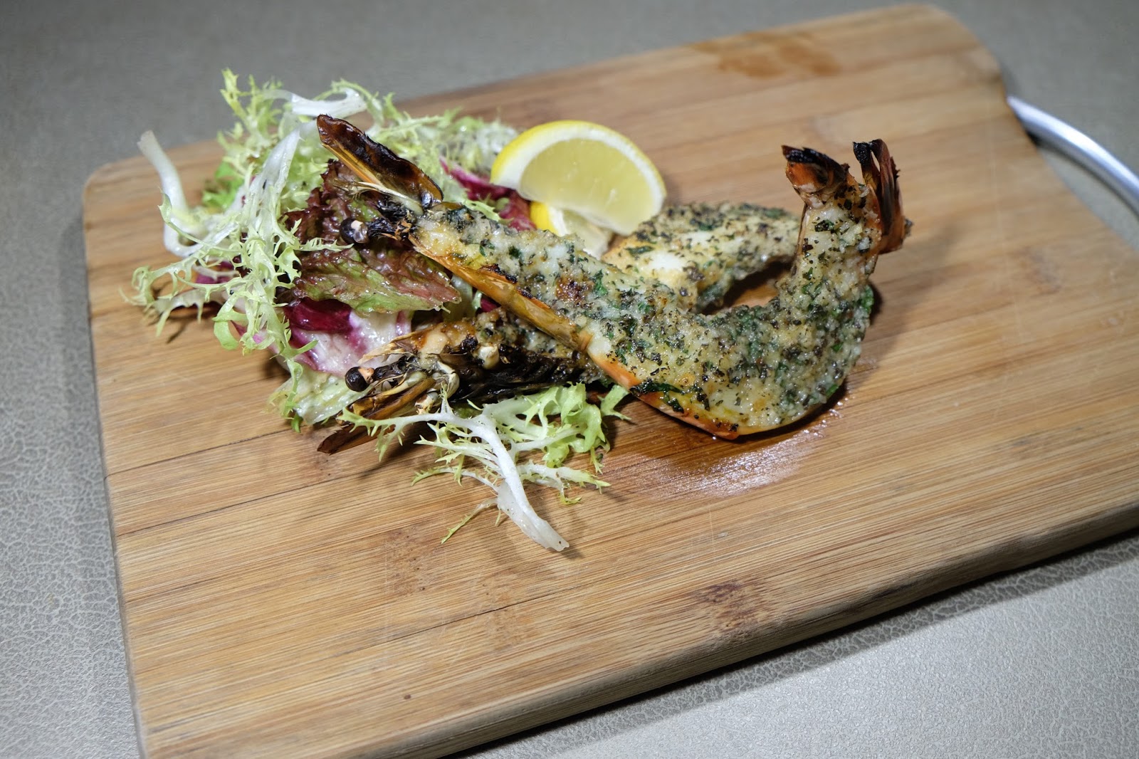 原隻大蝦開邊,蓋上大量的香草蒜蓉牛油,然後烤焗,香味都滲入蝦肉之內,而肉質依然爽彈,再澆點檸檬汁就更能提鮮。