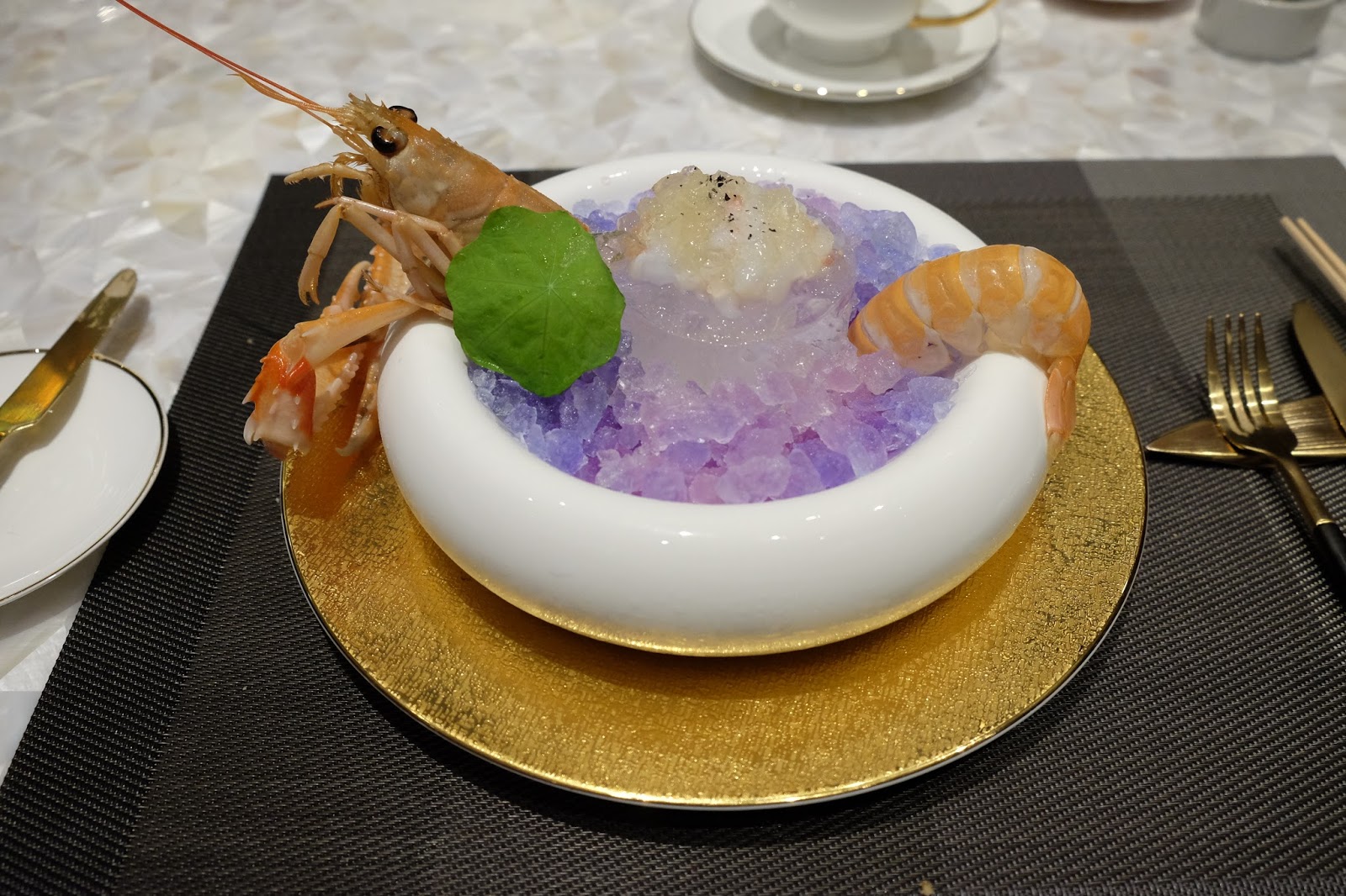 小龍蝦新鮮得似在碟裡爬出來,蝦肉爽彈得來又鮮甜,置面的jelly,是用鰹魚湯做加黑色海鹽製成,再澆上醬汁,慢慢變成艷麗的紫色,跟店名緊緊相扣,難怪是店方名物,好睇又好食。