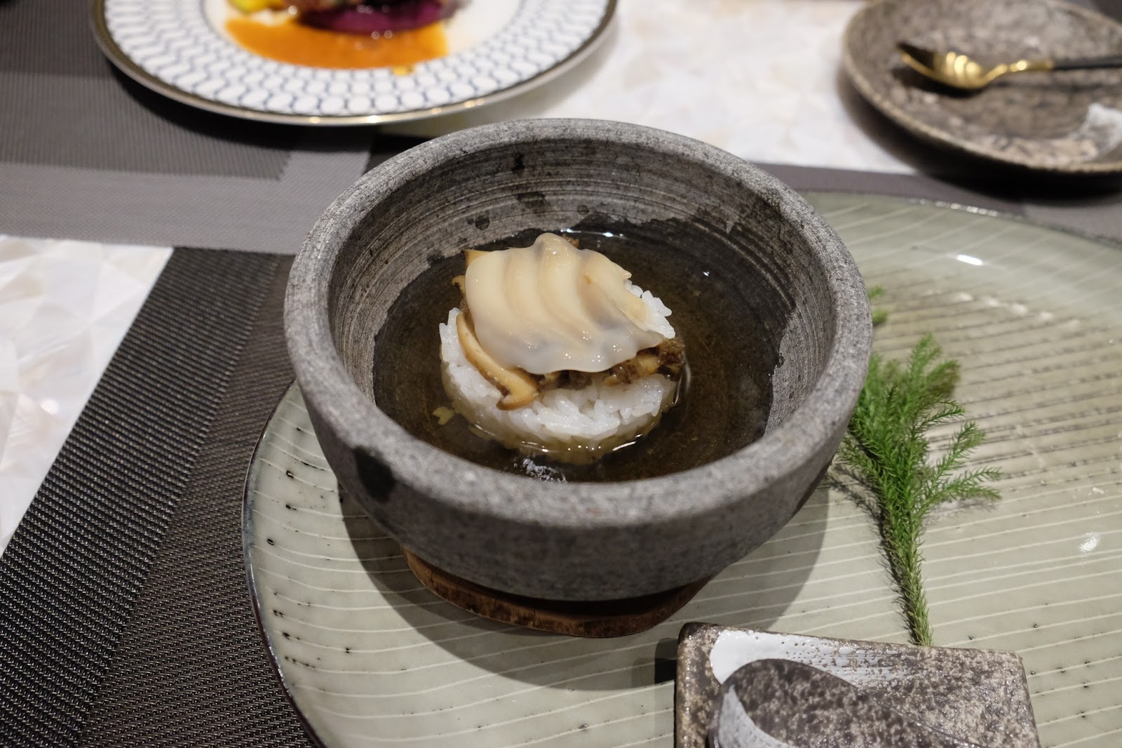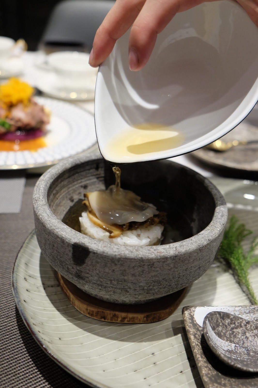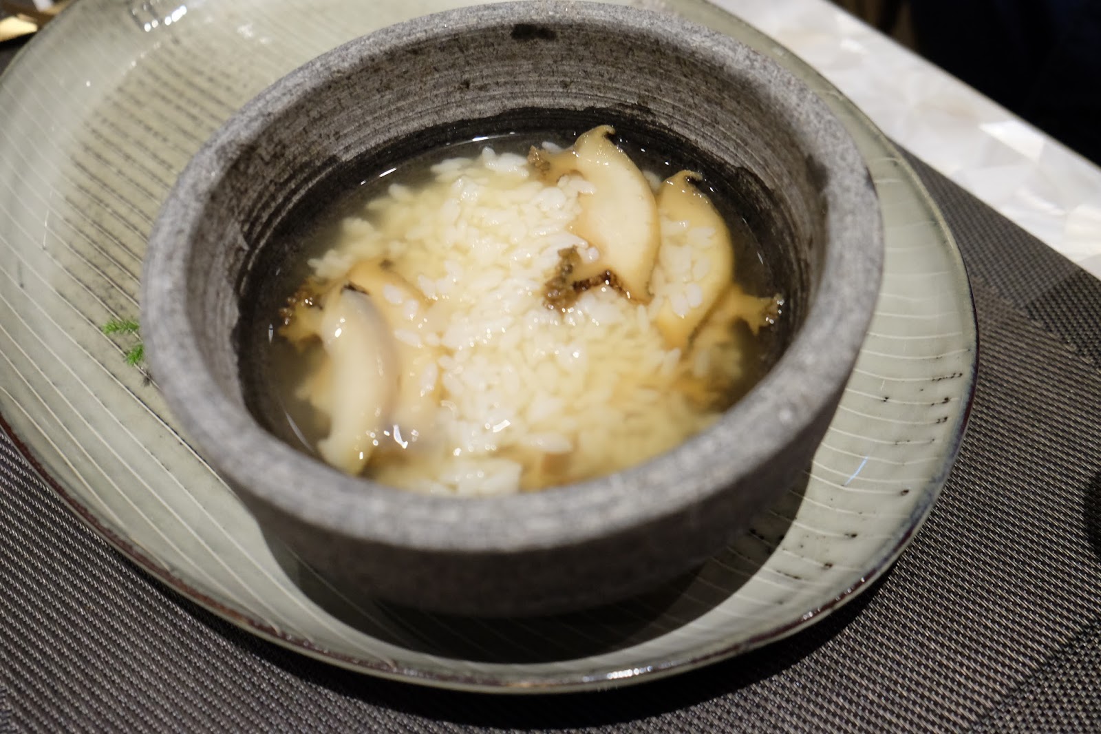 大家可要小心石鍋,因為早已預熱,鮑魚切片,吃之前注入鮑魚昆布湯,又可以加入海苔、蔥花之類,增添香氣,湯底清甜,用來泡飯一流。