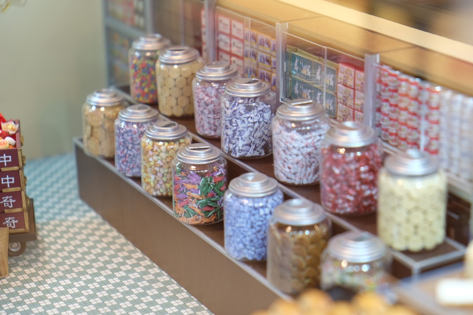 店內無論餅食,糖果都是按比例造成,最誇張是,就連糖果罐上的公仔圖案,都是鉅細無遺,單是這個模型,都足以家長帶小朋友來走一轉