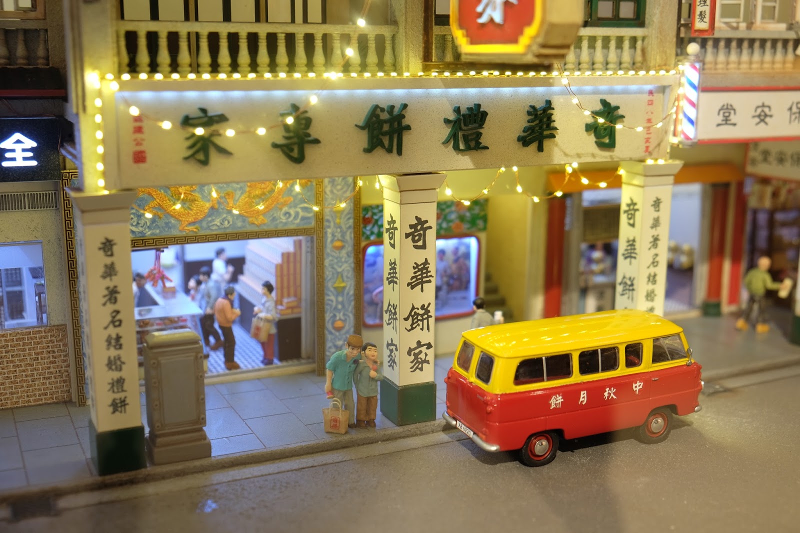 1:43的模型,呈現了「奇華餅家」第一間店舖與及五、六十年代上海街在中秋節的情景,而天台的小朋友在賞月、玩花燈的確活靈活現,放在門前的小貨車,更是奇華餅家當年唯一的外送車,真的別緻可愛