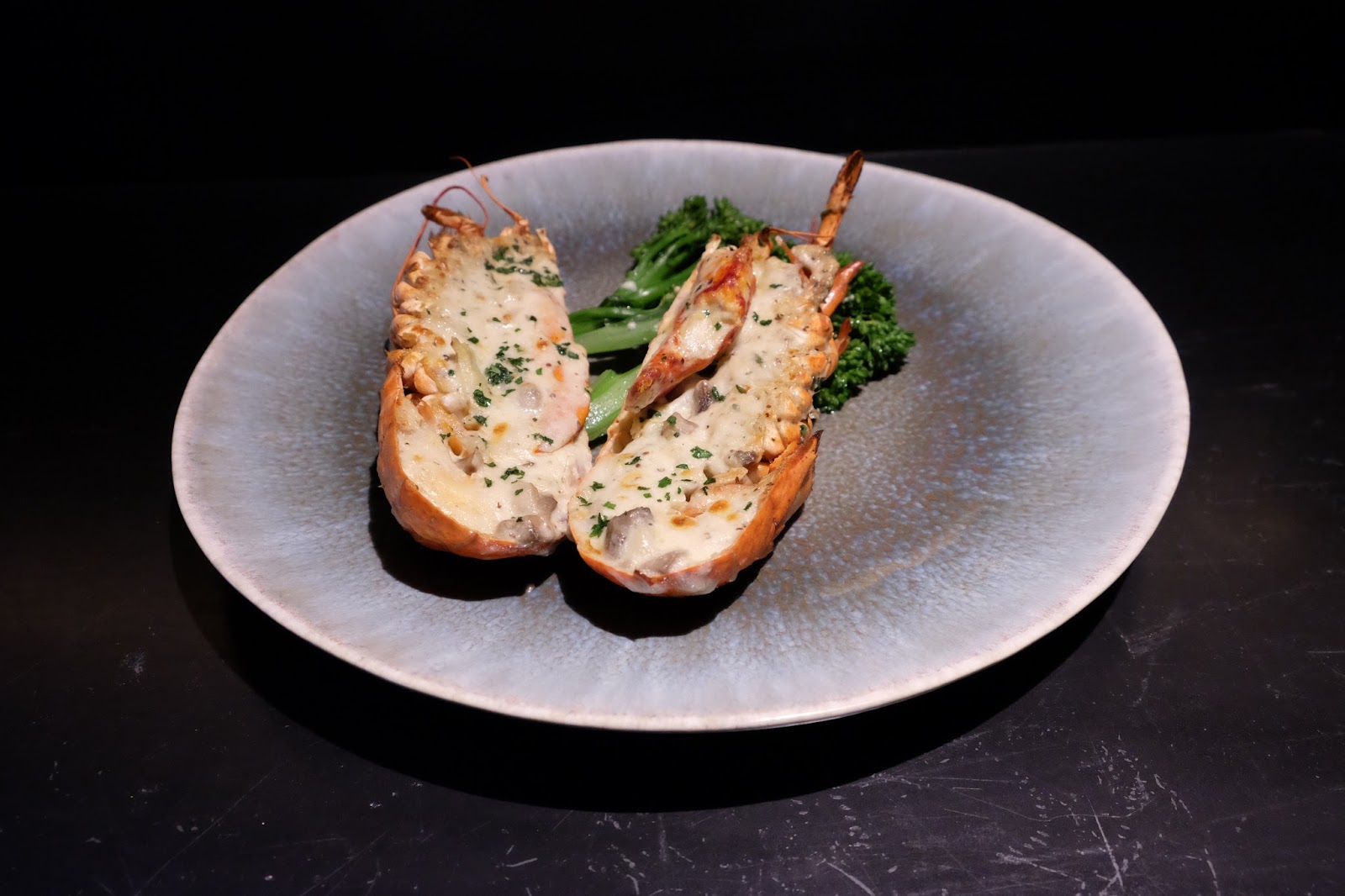 原隻焗波士頓龍蝦,蓋上一層濃香的芝士,用叉戳起蝦肉,咬落肉質爽甜,帶有芝士的幽香,好味。