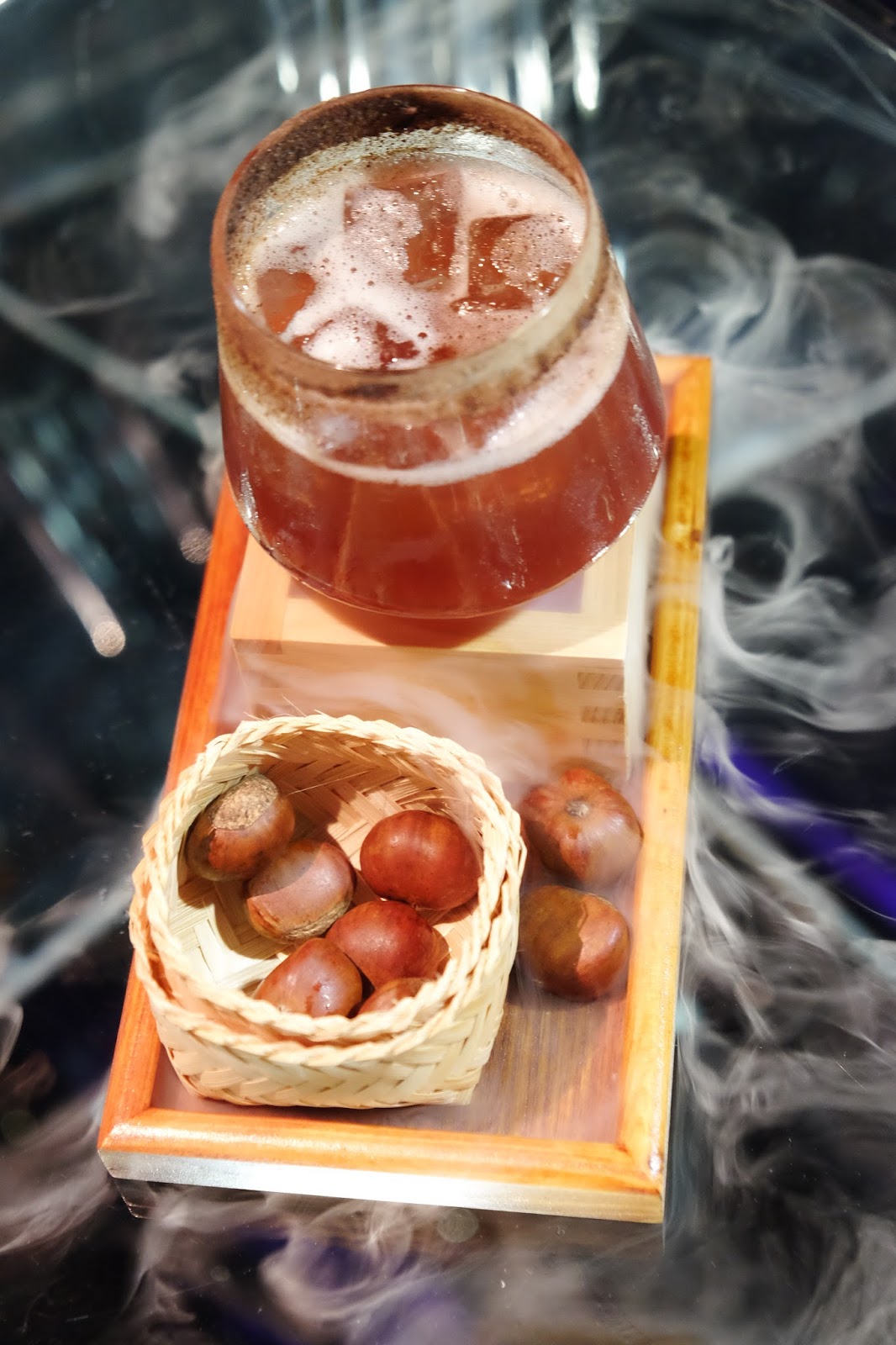 在四杯雞尾酒中,最吸睛的一定是由VodkaFrangelicoFig Liquer、檸檬汁、糖漿調製的Temple Street,一放上檯,即時雲霧繚繞仙氣四溢,賣相一絕,杯邊沾上了梅粉,喝起來,舌尖踫上了梅粉,口感實在特別,伴碟竟然是香甜的栗子,而不是花生,真是有趣的組合。