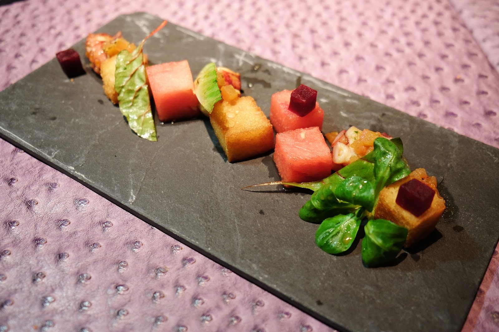 紅色是西班牙Rojo,一道常見的Tapas菜色,烤章魚事前經處理過,非常有嚼勁,伴碟的西瓜切成丁方,取了中間最甜美的位置,是截然不同的口感,既然是紅色,又怎可以沒有甜菜?吃起來真的爽朗可口。