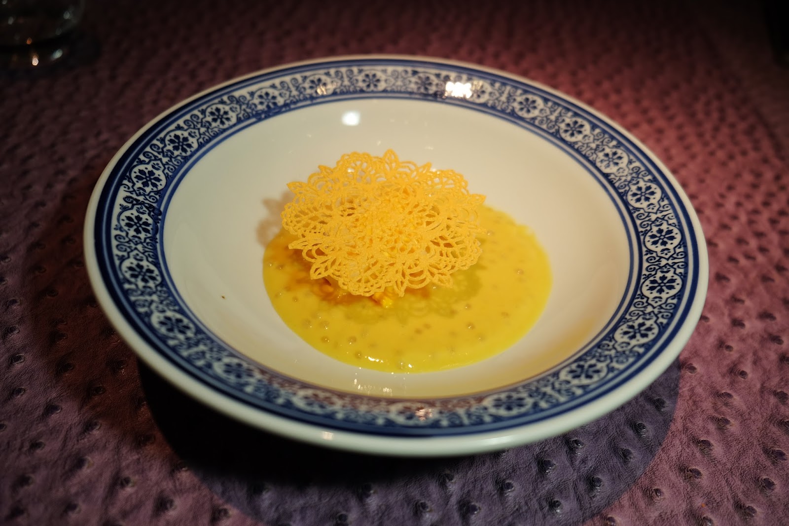 甜品是以橙色作主調的楊枝甘露,置面的通花脆脆,富有中國的色彩,沾上了由血橙、胡蘿蔔及椰子製成的楊枝甘露,真是別有一番風味。