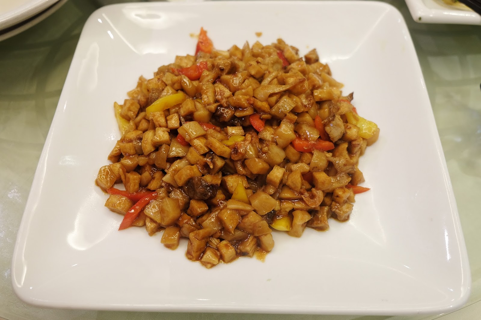 是一道可以拌飯或潮州粥的菜色,以豆乾及肉粒,加入辣椒同炒,芡汁不多,舀少許撈落白粥,簡單而味美,而且又有菜脯及欖菜可以任添,諗起都想食。