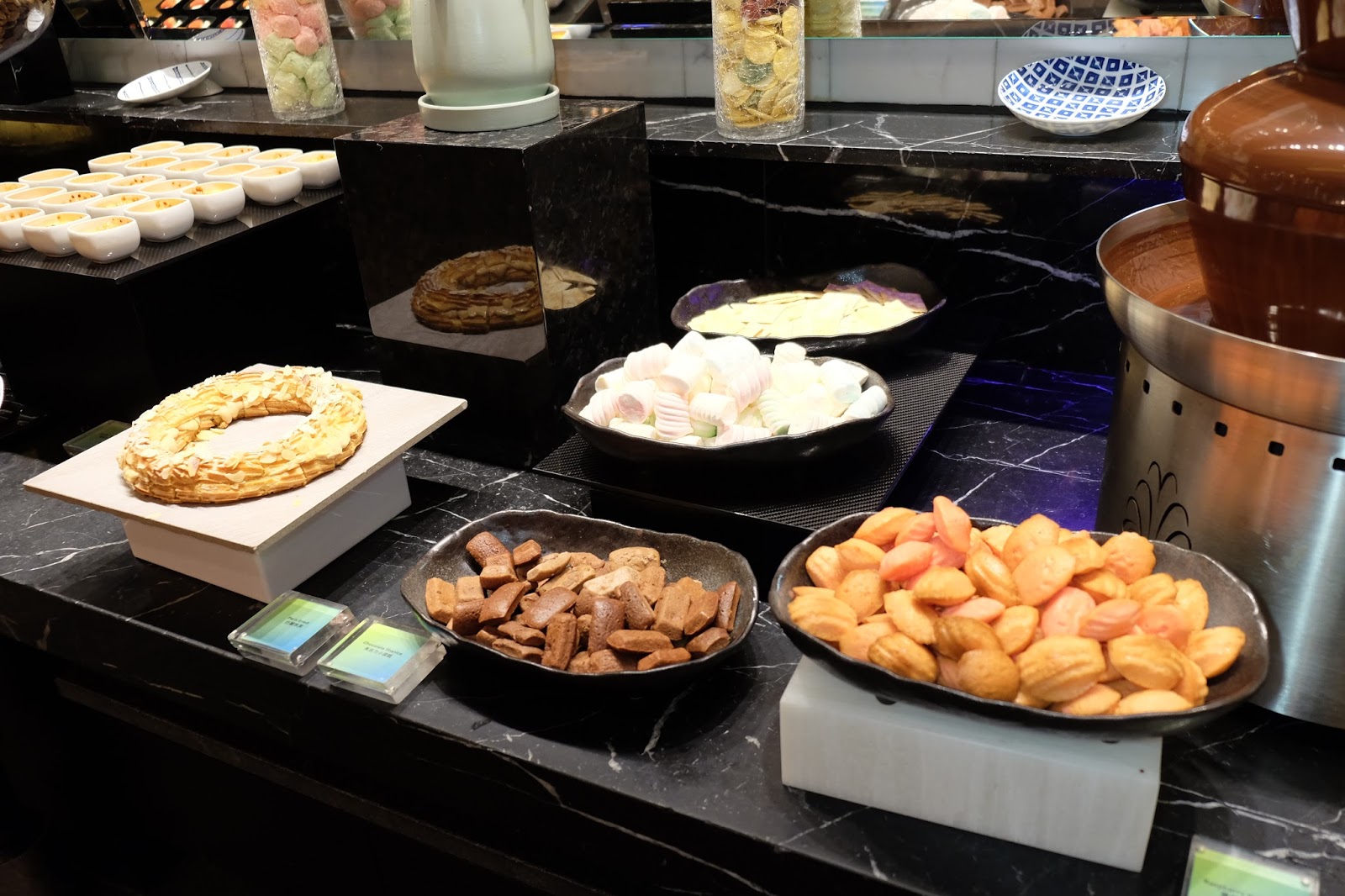 望望甜品區,有伯爵茶慕絲、焦糖吉士布甸、朱古力麵包布甸、黃梅撻、意大利芝士餅、雜果啫喱、士多啤梨雲呢拿撻、綠茶芝麻撻、芝麻綠茶慕絲曲奇、栗子千層蛋糕、芒果芝士蛋糕、巴黎泡芙、朱古力小蛋糕、雲呢拿焦糖燉蛋、歌劇院蛋糕、雜莓雲呢拿奶凍