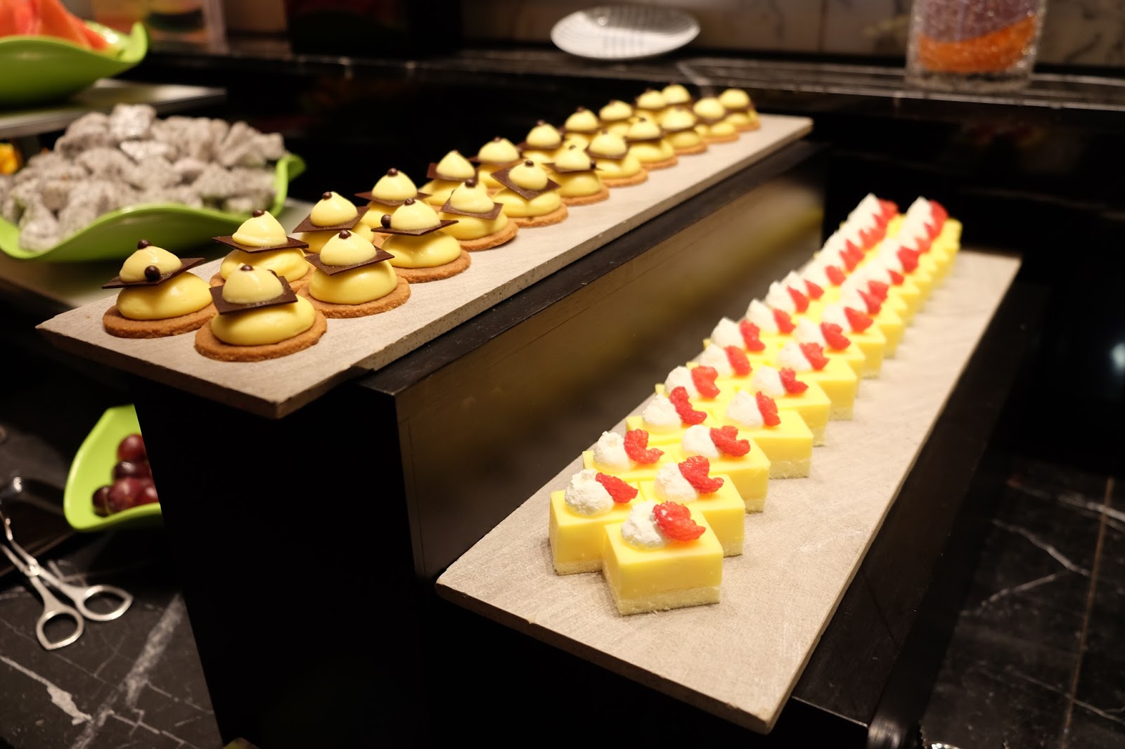 望望甜品區,有伯爵茶慕絲、焦糖吉士布甸、朱古力麵包布甸、黃梅撻、意大利芝士餅、雜果啫喱、士多啤梨雲呢拿撻、綠茶芝麻撻、芝麻綠茶慕絲曲奇、栗子千層蛋糕、芒果芝士蛋糕、巴黎泡芙、朱古力小蛋糕、雲呢拿焦糖燉蛋、歌劇院蛋糕、雜莓雲呢拿奶凍