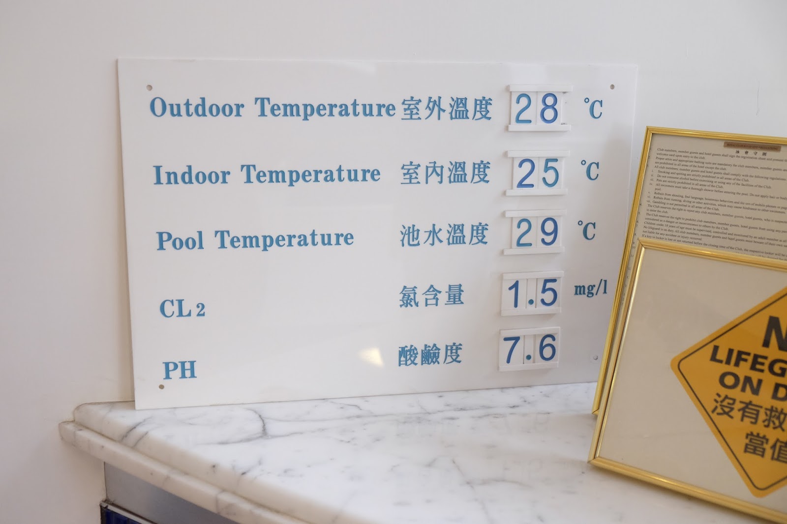 至於酒店設施,先跑去室內恆溫泳池,職員當日會將池水的溫度、氯含量及酸鹼度標明,好細心。