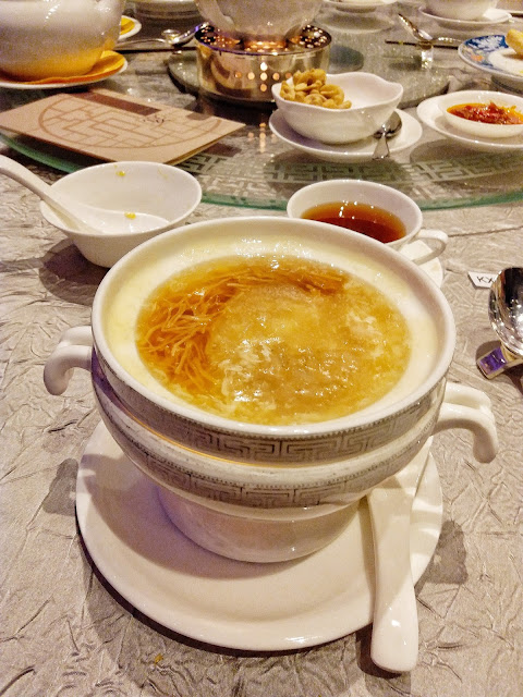 原盅上,用蠟燭保溫,每口湯羹都熱氣騰騰,玻璃芡勾得恰到好處,瑤柱絲推得夠散,同時有爽口滑溜,鮮甜味美的感受。