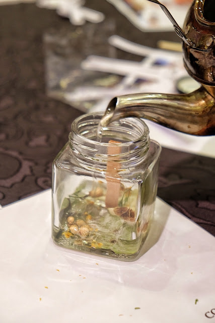 大家先把早已預備的乾花放入玻璃瓶內,然後注份果凍蠟,可以放埋一邊等待慢慢凝固。