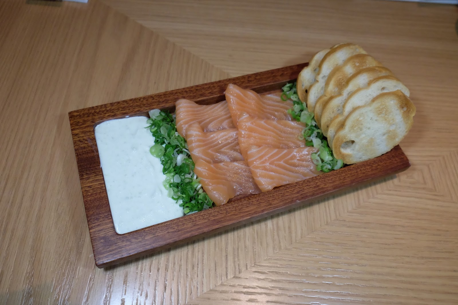 在煙三文魚肉塗上一層山葵忌廉,口感滑溜中帶些少辛香,令魚肉不再單調。