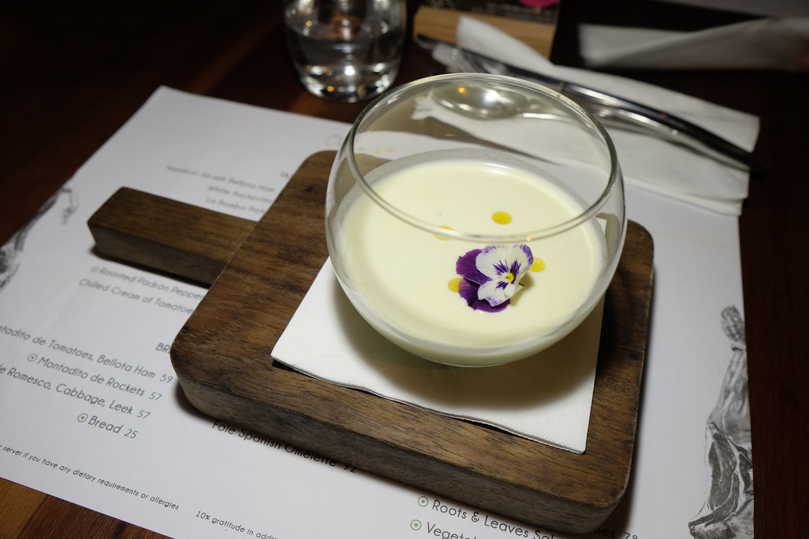 這道凍湯賣相簡單亮麗,放上花瓣來點綴,雖就杏仁,但瀘得清,不論質感或味道,都不覺杏仁味,舀一下,碗底的青提子帶來清新的口感。