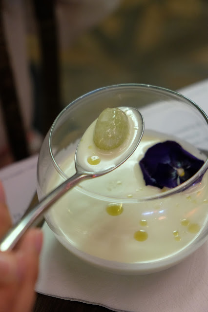 這道凍湯賣相簡單亮麗,放上花瓣來點綴,雖就杏仁,但瀘得清,不論質感或味道,都不覺杏仁味,舀一下,碗底的青提子帶來清新的口感。