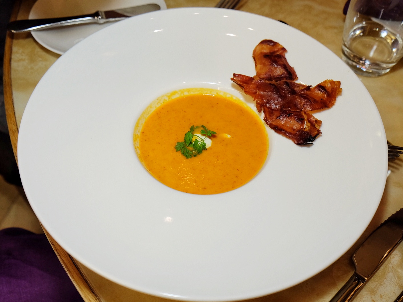 未放上檯,空氣中已傳來陣陣番茄的香味,舀一下,很濃稠的質感,呷一口,天然的果酸不會太強烈,反而令人胃口大開,有時候,簡單但用心,會有意想不到的效果,只不過略嫌伴碟的巴馬火腿炸得太乾身。