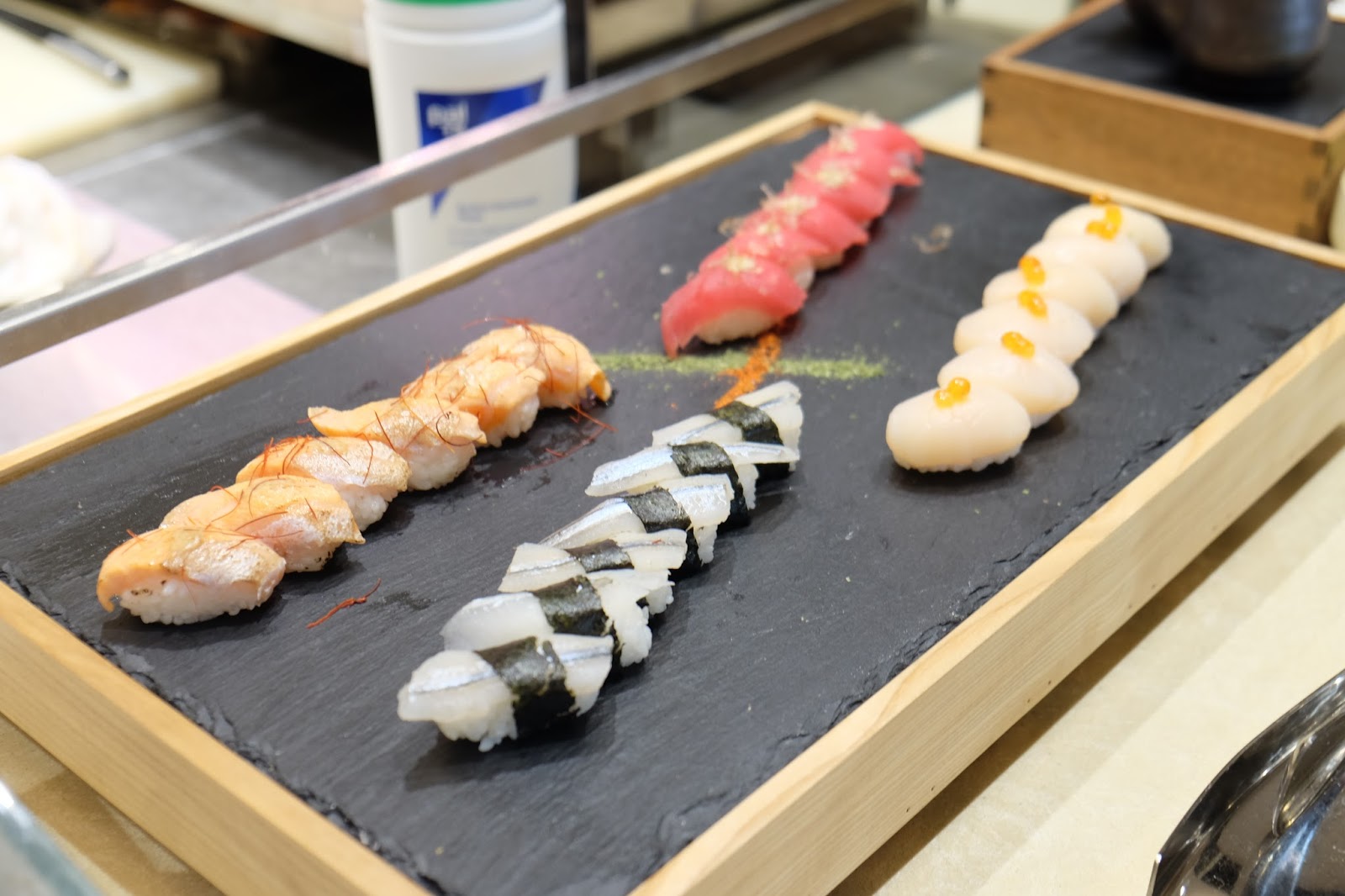 有帶子壽司、八爪魚壽司、吞拿魚壽司及炙三文魚壽司。