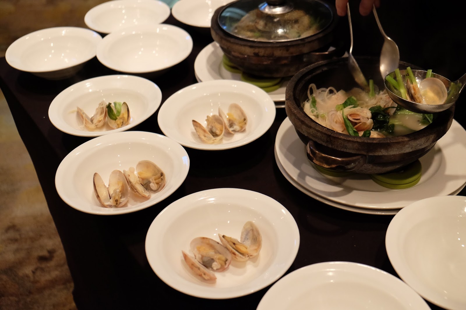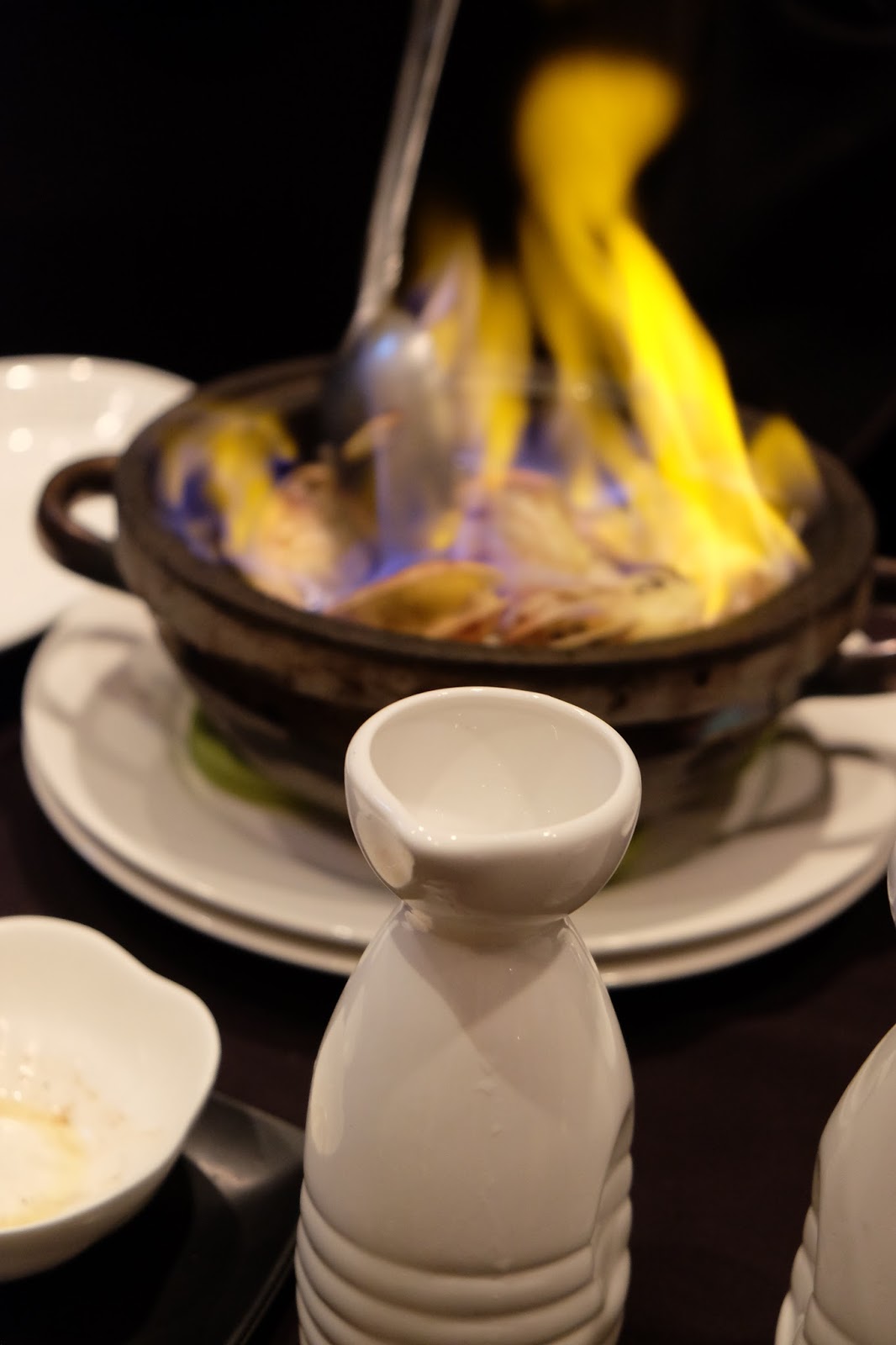 先是堂弄火焰清酒胡椒花蛤皇,用燙了的砂鍋把薑絲炒香,然後放入花蛤皇炒至半熟,最後澆上玫瑰露酒及點火,即時瀰漫了香氣,花蛤肉蘸滿了酒香,肥美可口。