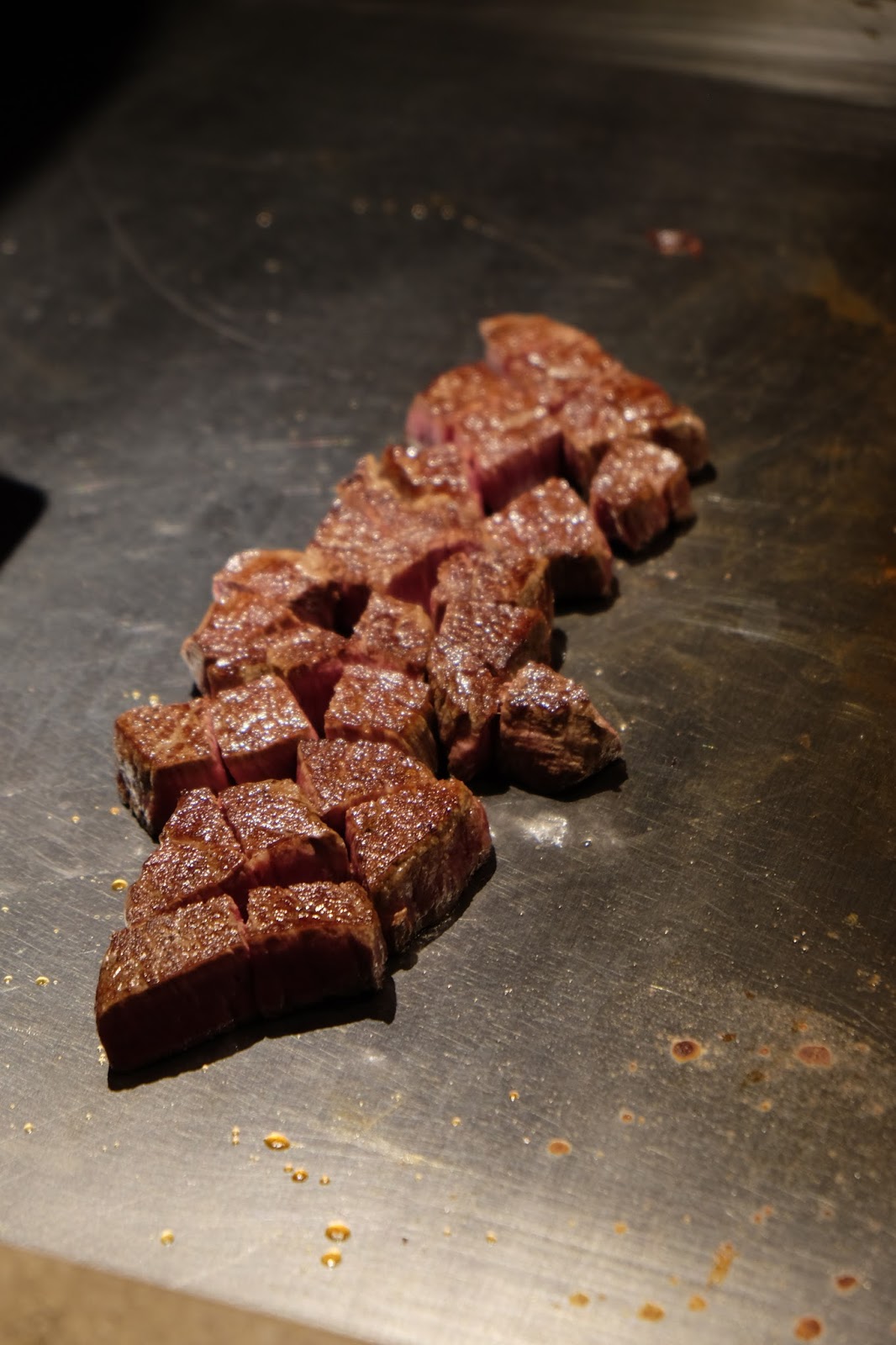 sauce、酸汁配蘿蔔茸、芝麻醬及芥末五款蘸料,牛柳煎至medium rare,切開時,望見嫣紅肉質已經令牛魔王食指大動,先試試不添加任何醬料的原味,肉質軟稔而不失嚼口,肉味更是濃郁,超正,配上不同蘸料更帶出不同風味,伴碟的蒜片少得香脆,用來佐酒一流,至於南瓜片、小青椒及茄子件,都煎得啱啱好,師傅拿捏時間很準繩。