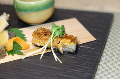 三文魚籽咸香有彈性,新鮮就是不一樣,放上少許金箔更顯名貴;鰻魚烤得恰到好處,塗上燒汁增添美味;鮑魚鹵得入味,柔韌有嚼口,確實美味。