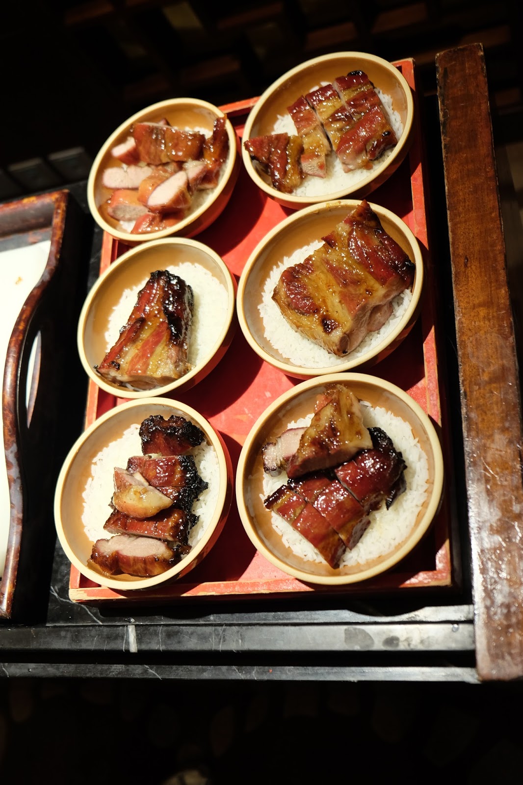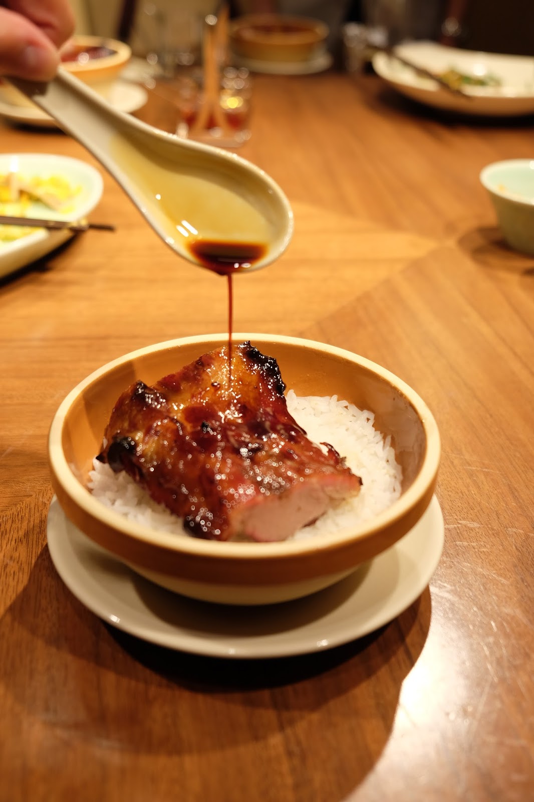 挑選了豬肩位,肉味香濃又有嚼口,先烤焗好,然後由師傅即場澆上玫瑰露酒,再加火炙,即時焦香、肉香及酒香四溢,完全挑起了食慾,如果人多,更可以自行選擇半肥瘦、走肥或是焦香,放上蒸飯面,再淋上豬油及醬油,真是人間美味超正,不過要早一日預訂,否則只有望住人家流口水。