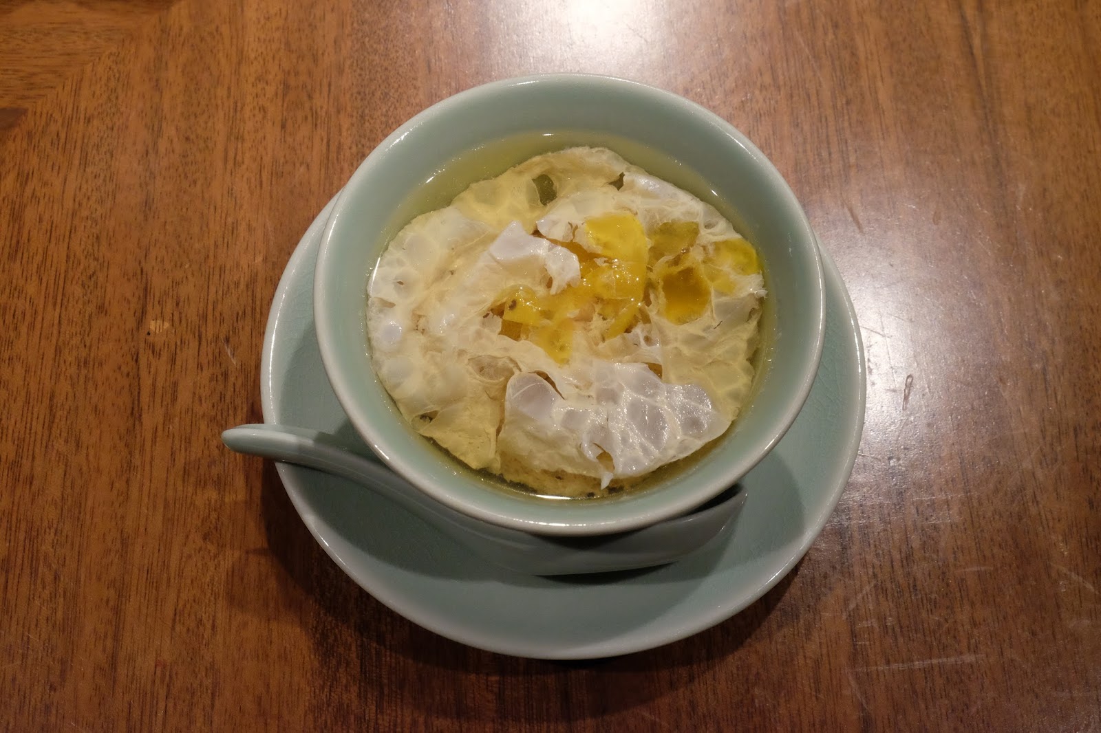 雖然是花上好幾小時清燉,但湯色清澈見底,以天籽蘭入饌更是少見,簡單的以肉汁吊起鮮味,呷一口,甘香醇厚,有種舌底生津的感覺,