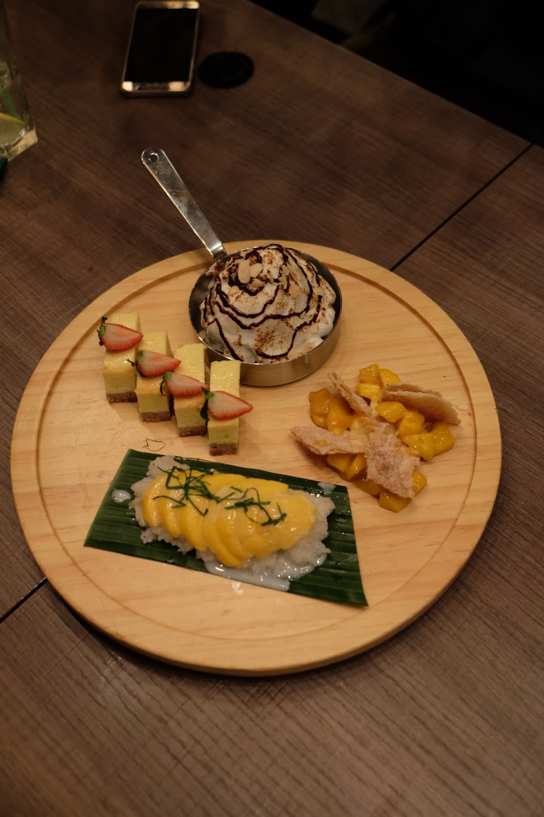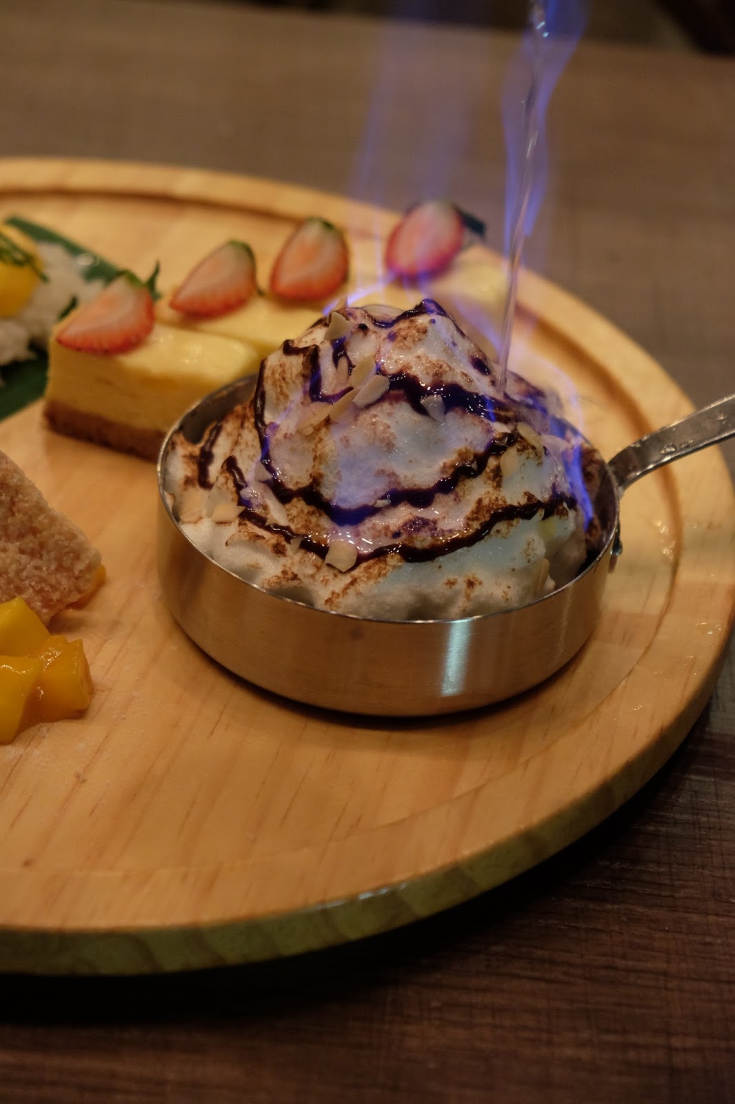 鮮芒果拿破崙、芒果糯米飯、芝士餅及火焰雪山