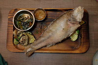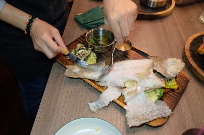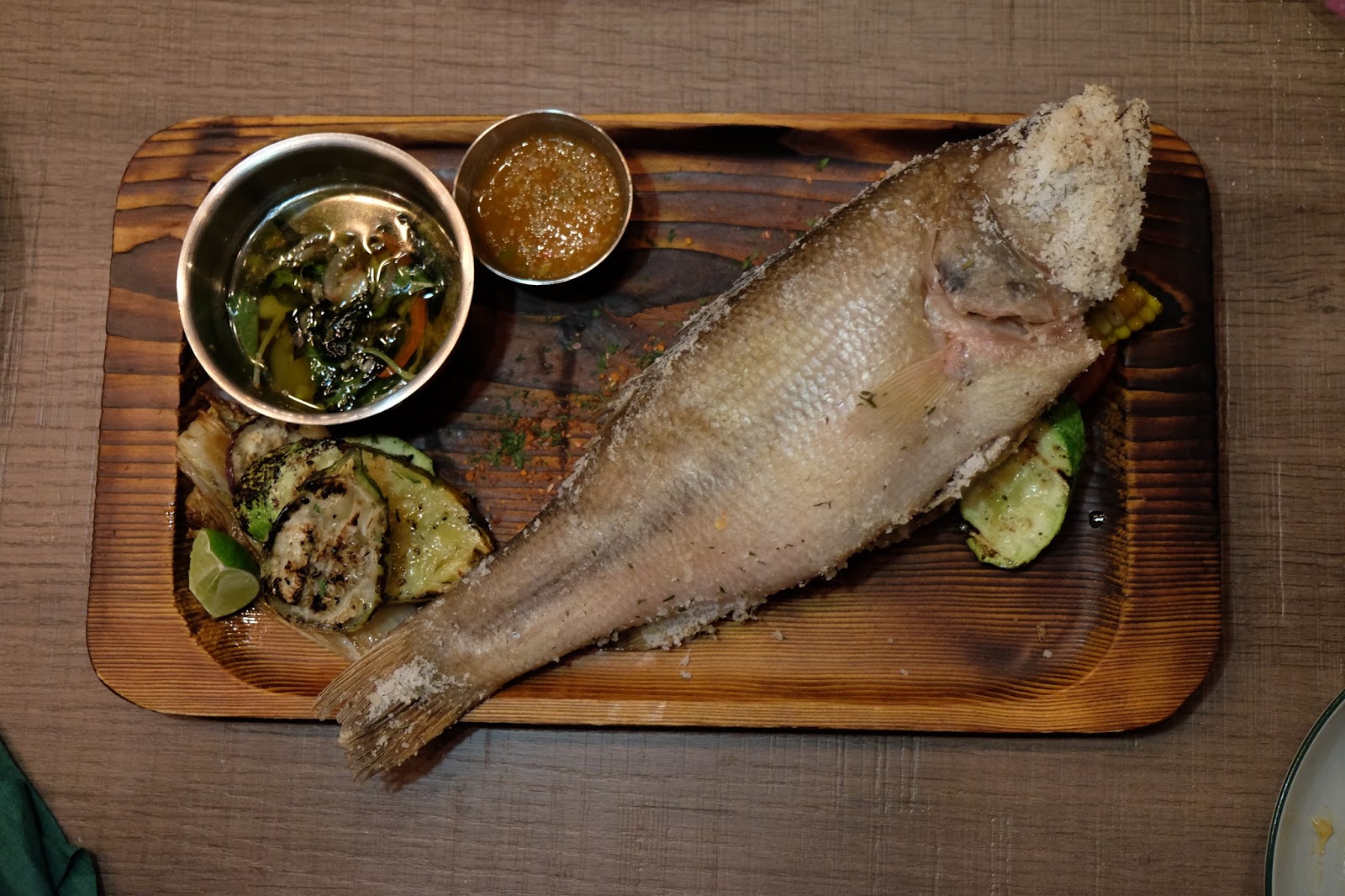 整條鱸魚用海鹽包好再烤焗,魚肉不單保留了肉汁,肉質份外嫩滑,咸度恰到好處,如果略嫌單調,大可蘸點特製的燒魚醬,就更具風味。
